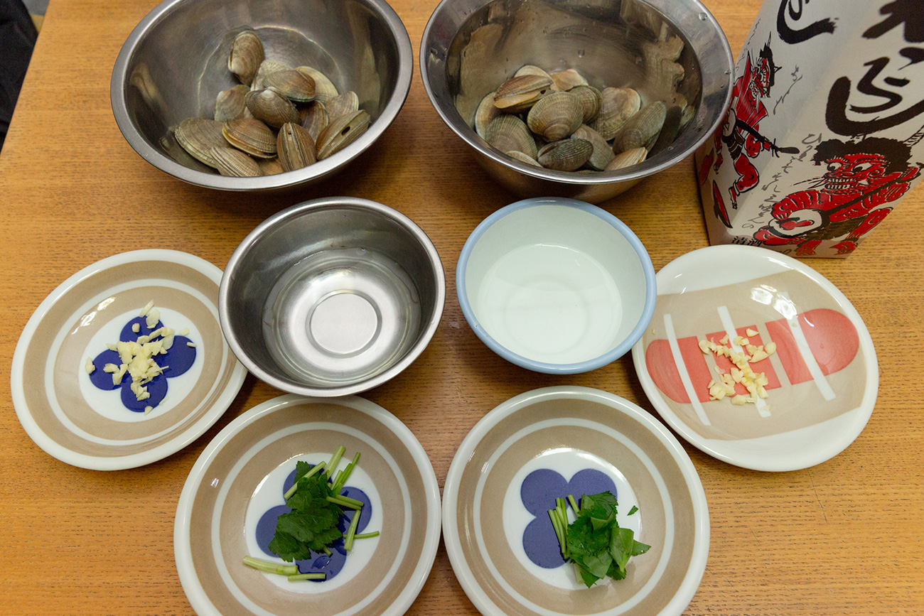 検証に使う料理はアサリの酒蒸しと肉じゃがで決定。それぞれ酒ありバージョン、酒なしバージョンを用意することを決めると、オサダ記者が腕をふるって自宅で調理してきてくれました。ちなみに酒は日本酒「鬼ころし」を使用しています。