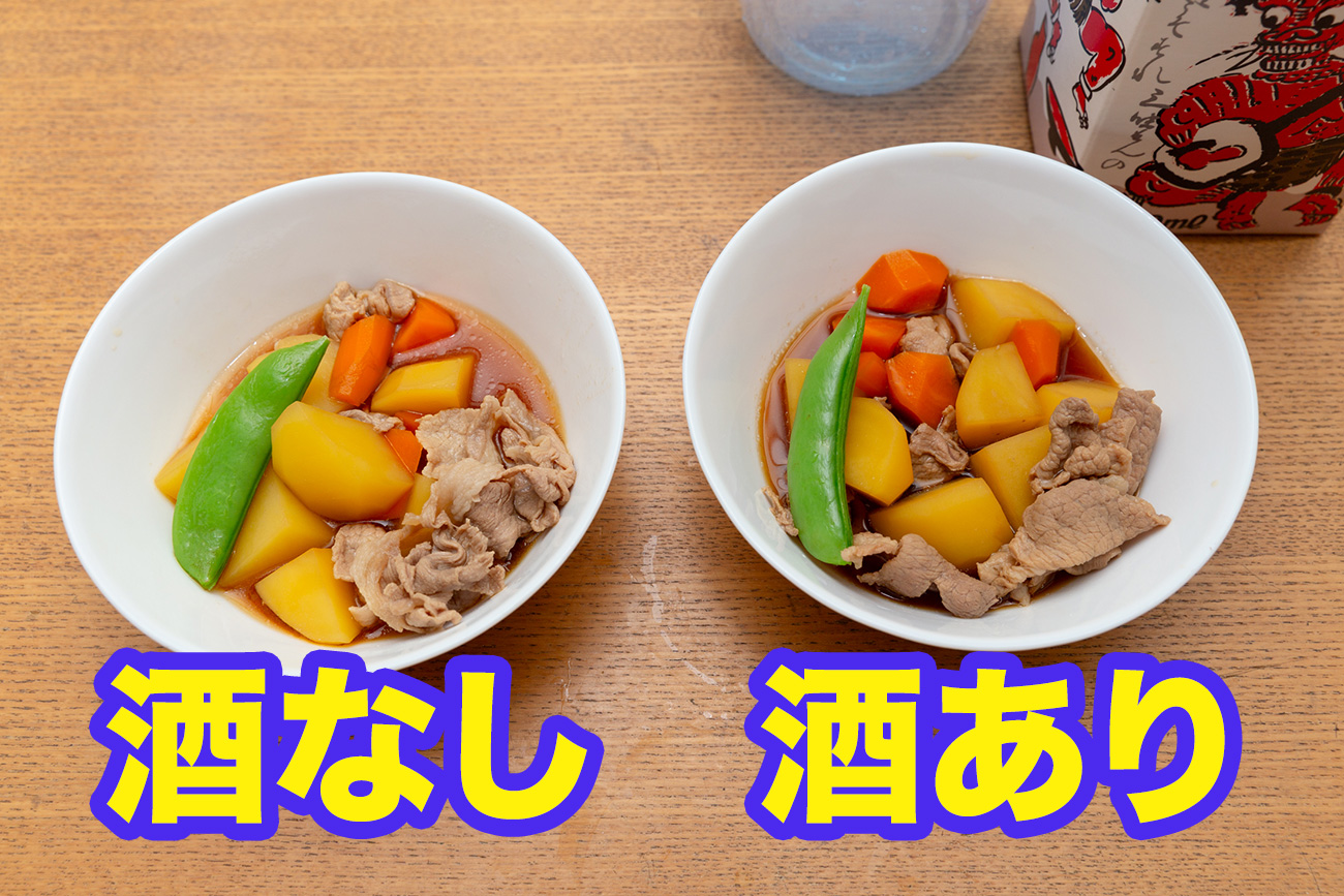 アサリの酒蒸しと肉じゃがをそれぞれ酒あり・酒なしで作り、その味を解析してみた結果、どちらも酒を入れると多少ではあるもののコク(総合的な味の強さ)が確実にアップしました。