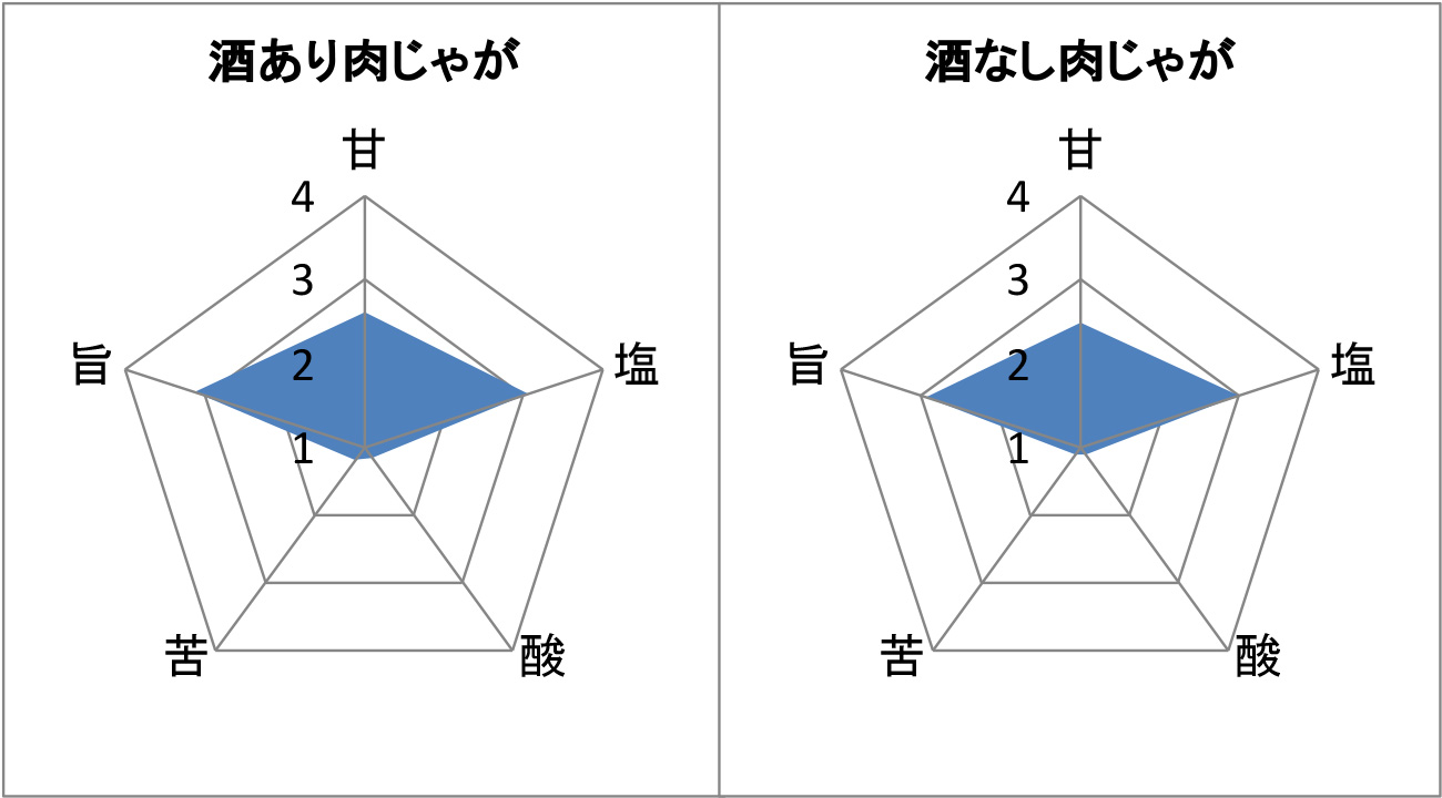 甘味、塩味、酸味、苦味、旨味の数値を比べてみると、酒ありのほうが全体的にレーダーチャートがやや大きくなっていますが、際立って数値が上がっている項目はないようです。これはやはり酒が醤油や塩、酢などと属性が違う調味料だからなのでしょう。