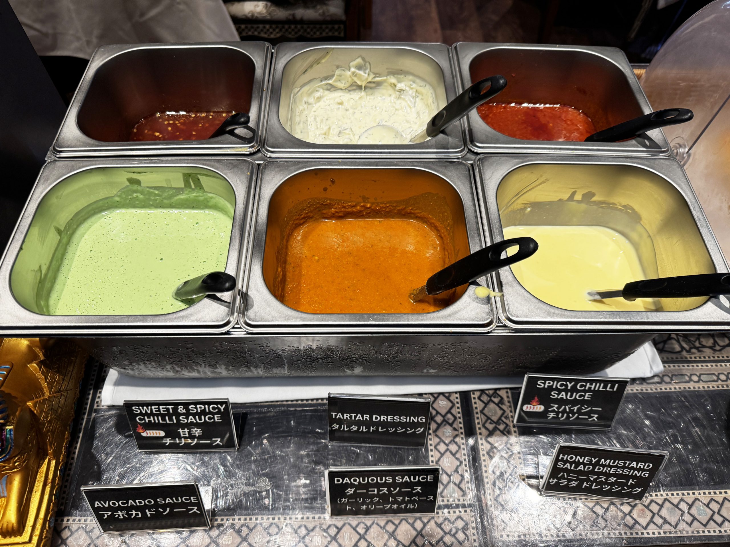 チリソース、タルタルドレッシング、スパイシーチリソース、アボカドソース、ダーコスソース、ハニーマスタードサラダドレッシングなど、ソース系が充実している。