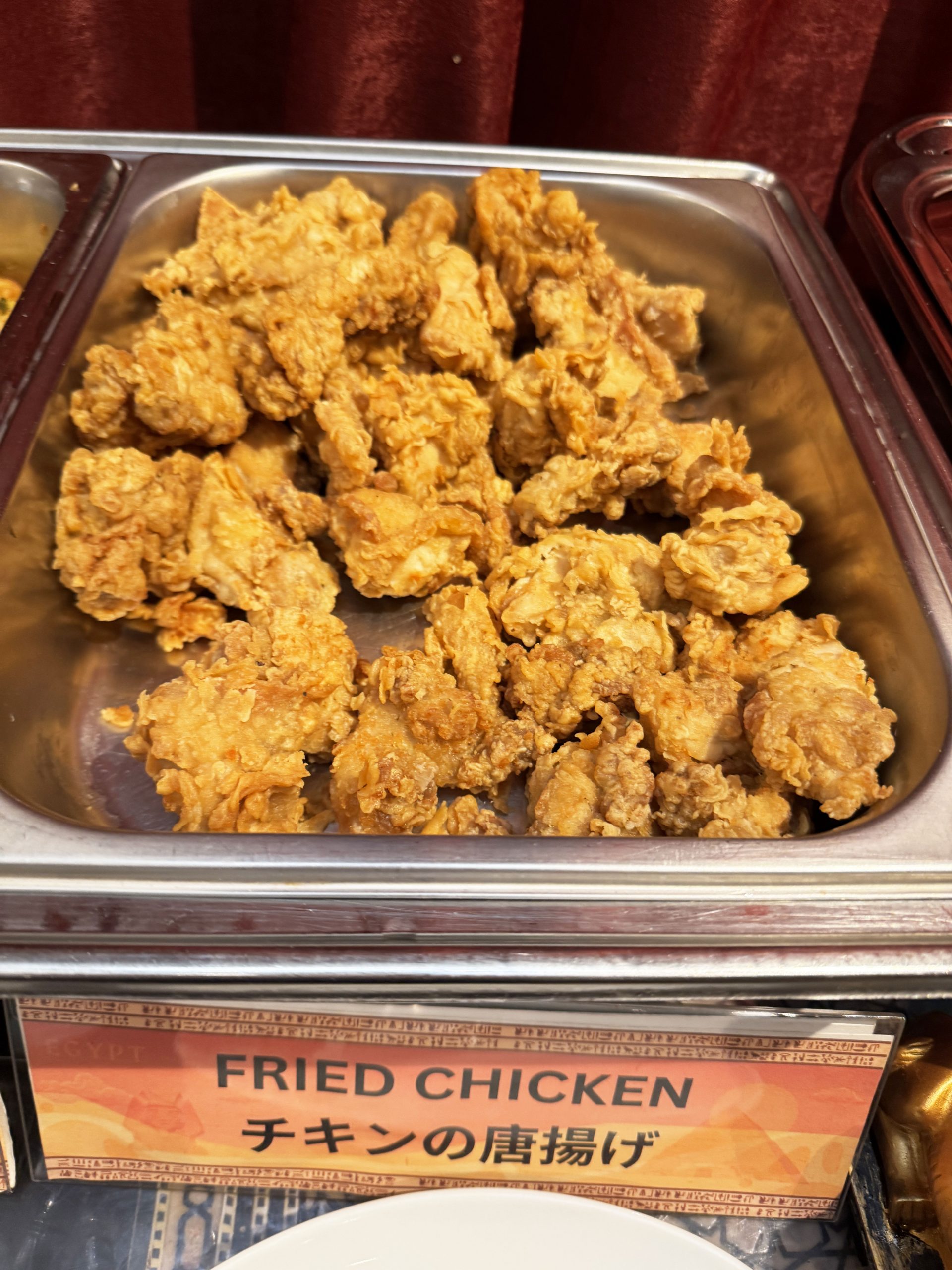チキンの唐揚げは、衣がカリカリに仕上げられていて、トングでつまんだだけで伝わってくるザクザクカリカリ感。油でベチャベチャになっていないから好感が持てる。