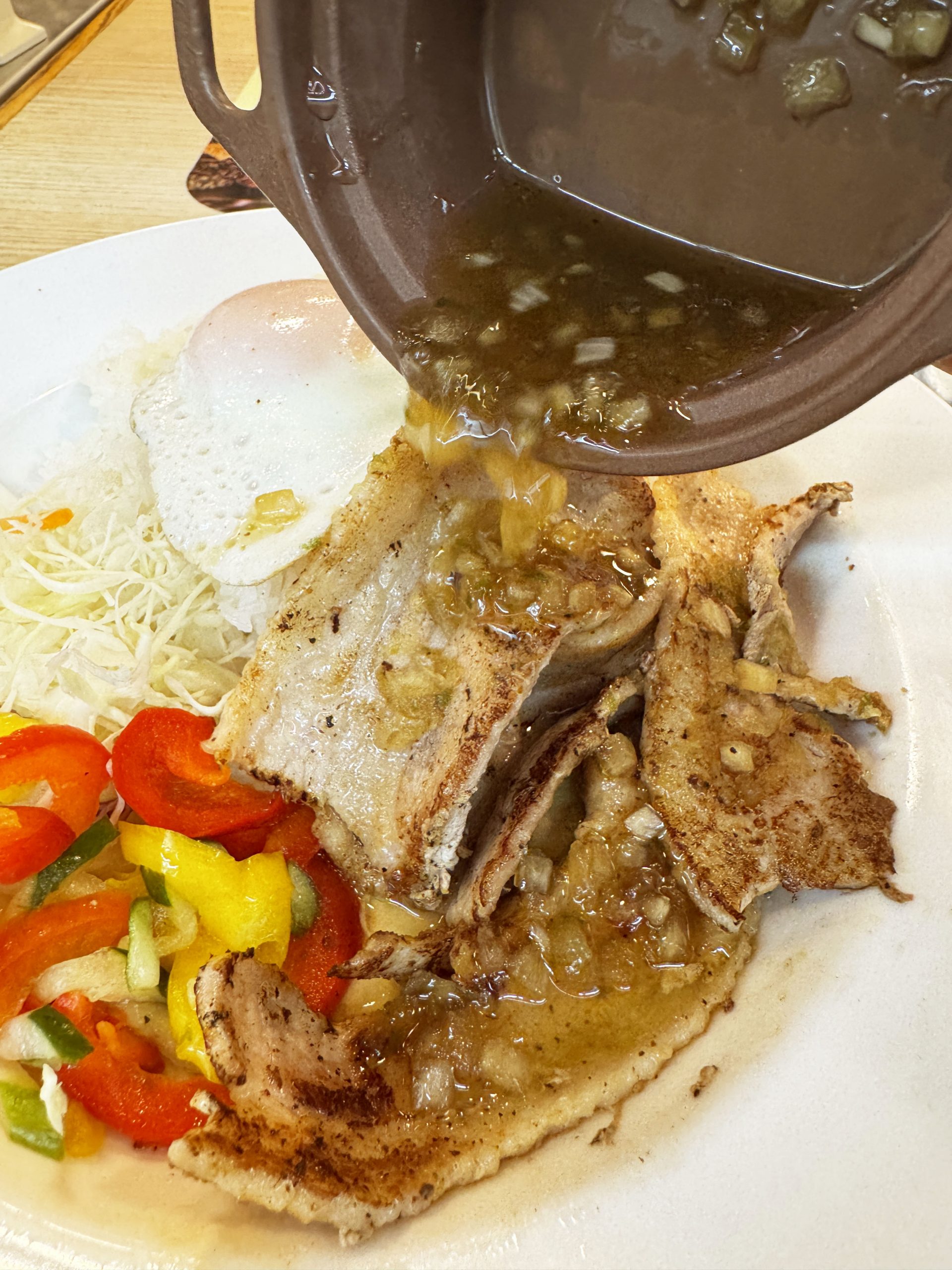 いいかい学生さん、ヌクマムソースをな、コムタム風ポークライスにヌクマムソースをかけるとかなりソルティーでスパイシーだよ。