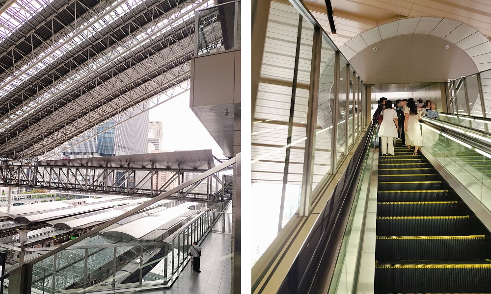 ▲左:ドーム状の屋根が特徴的な大阪駅。右:映画館がある屋上へと繫がる長いエスカレーター