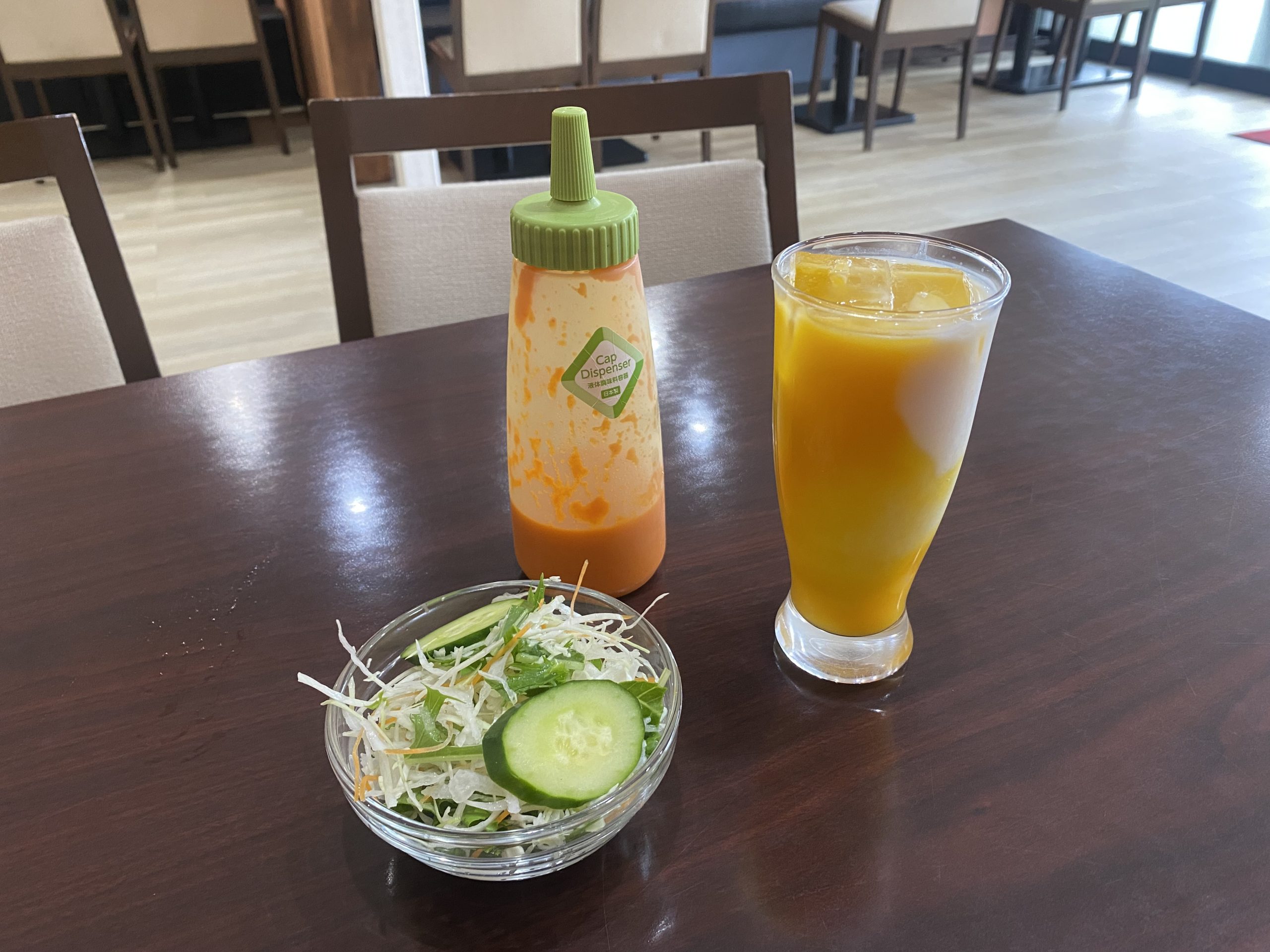 ▲まず到着したのは、サラダとソフトドリンクのマンゴーラッシー。