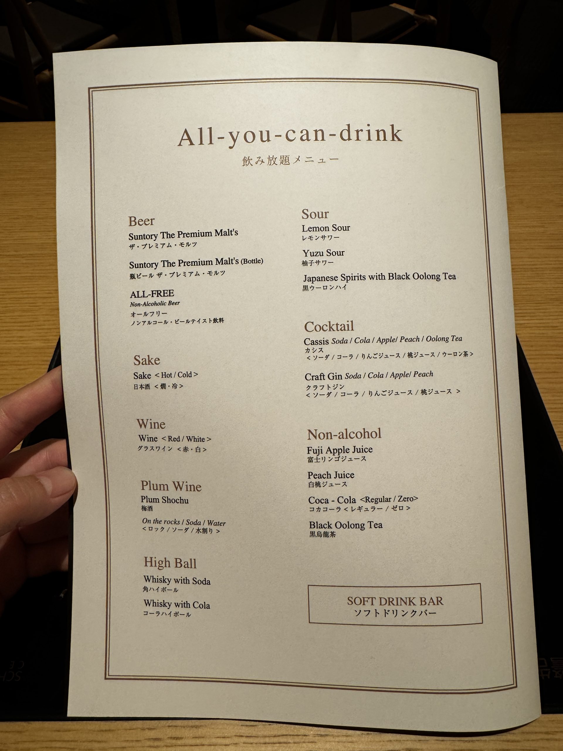 お店、かなり高級感がある。しかし高級すぎず、落ち着く雰囲気に仕上がっている店内。安っぽさはいっさい感じない。ファミレス的な雰囲気でもないところが新しい。店内に入って着席。初日は招待客が多いのか、スーツの人たちが多かった。