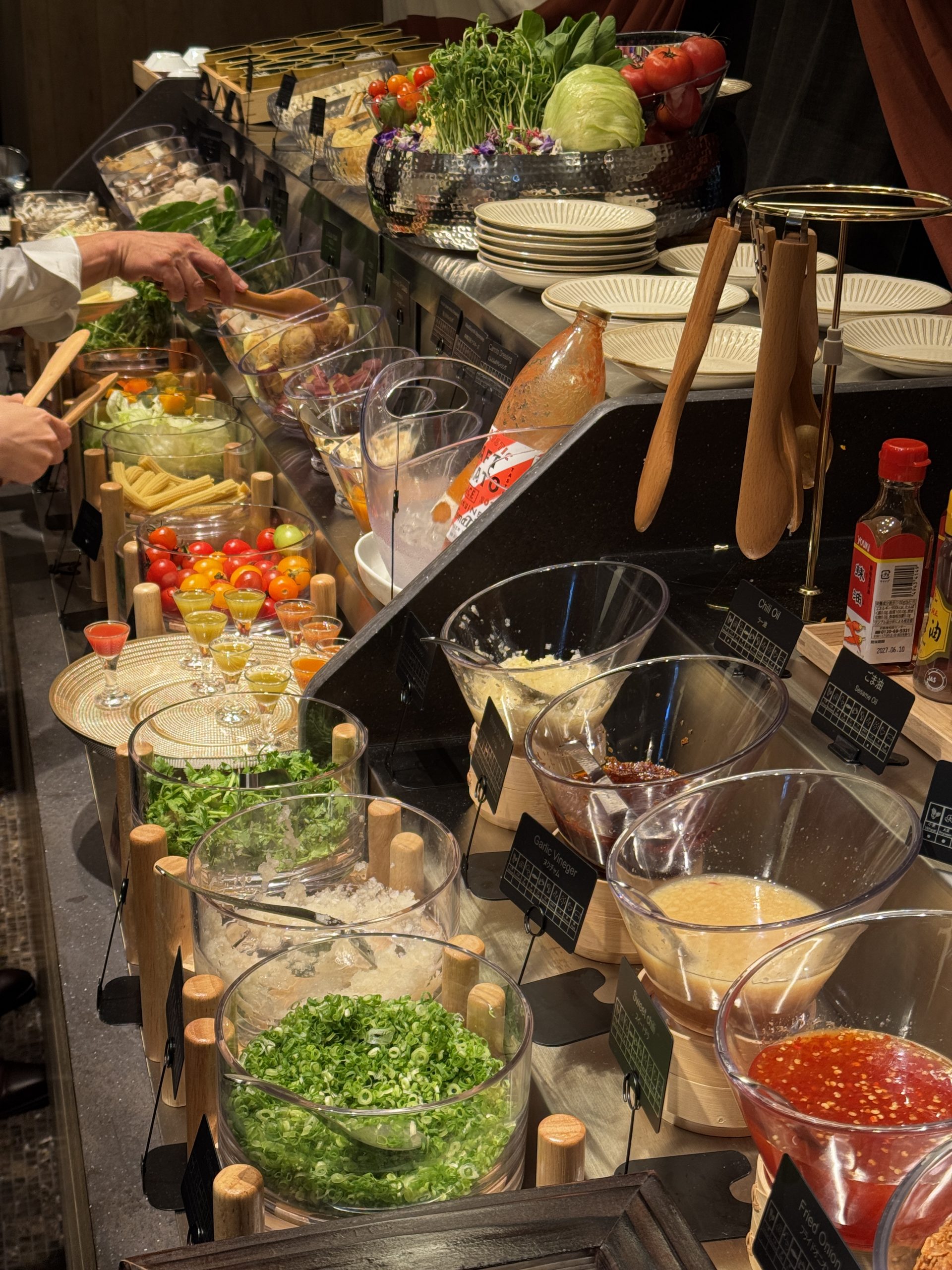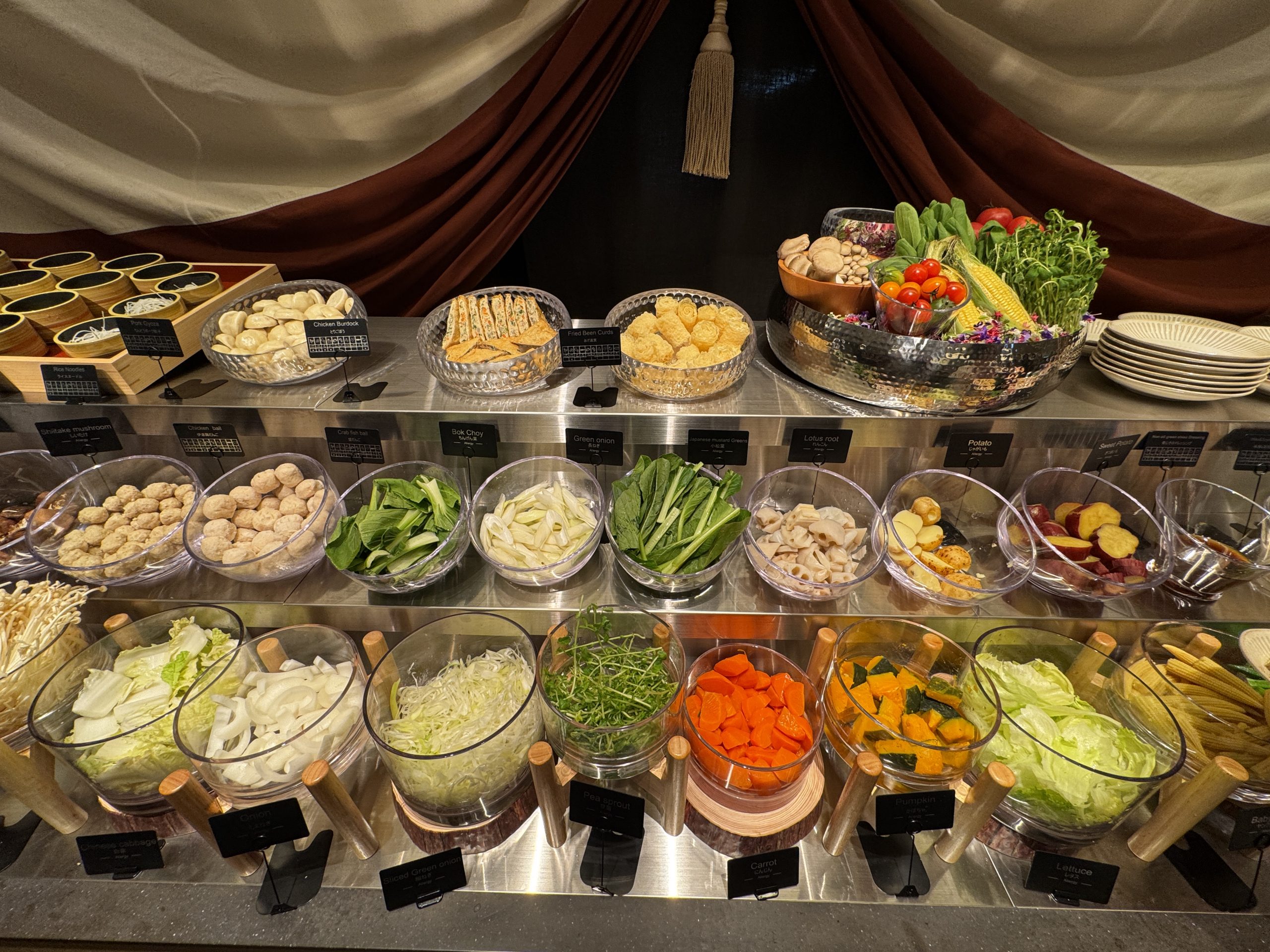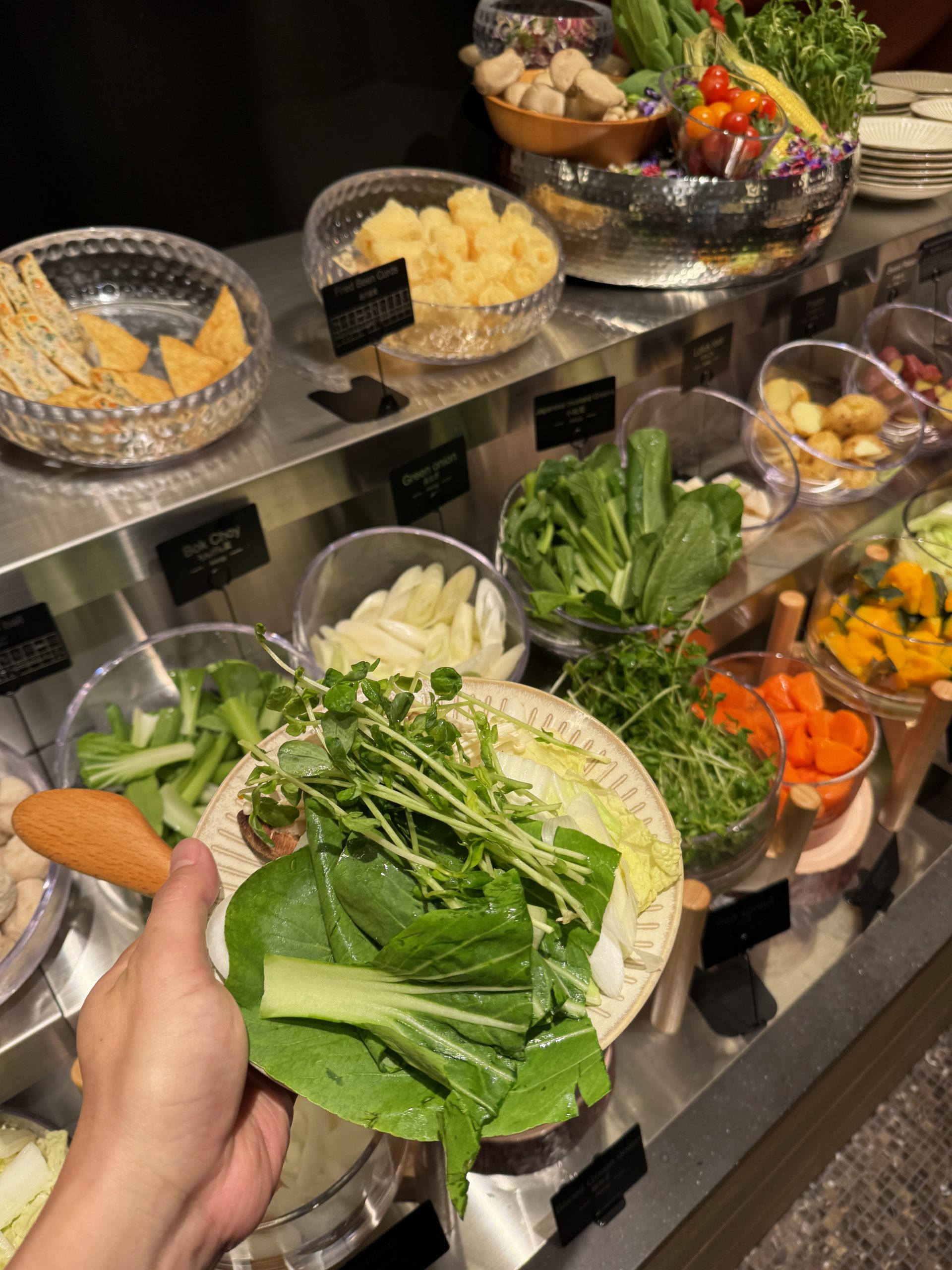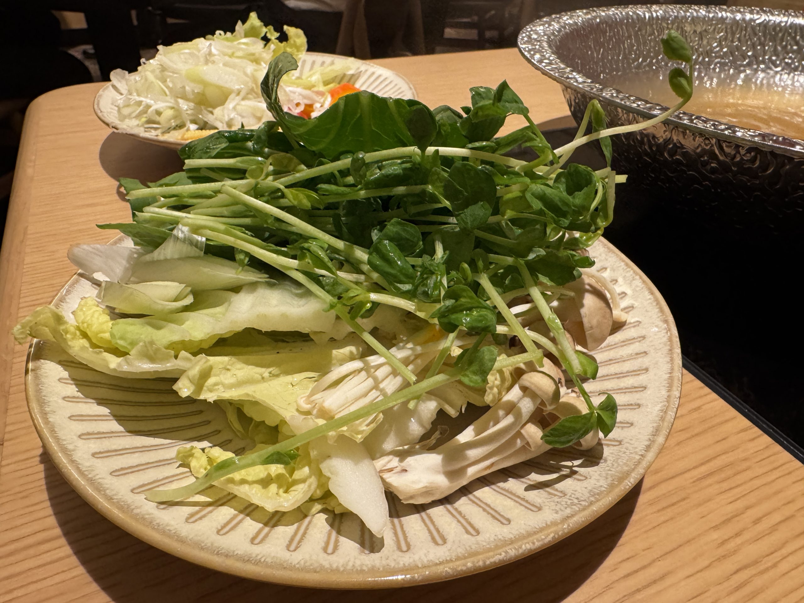 牛肩ロース、牛バラ、豚ロース、豚バラをオーダー。肉以外はセルフで皿に盛っていく。野菜は白菜、タマネギ、長ネギ、レタス、チンゲン菜、小松菜、豆苗、ニンジン、カボチャ、ヤングコーン、さつまいも、じゃがいも、れんこん、しいたけ、えのき、ヤングコーン、トマトなどほか多数。ほかにも鶏だんご、蟹だんご、玉こんにゃく、ライスヌードル、うどん、中華麺なども用意されている。