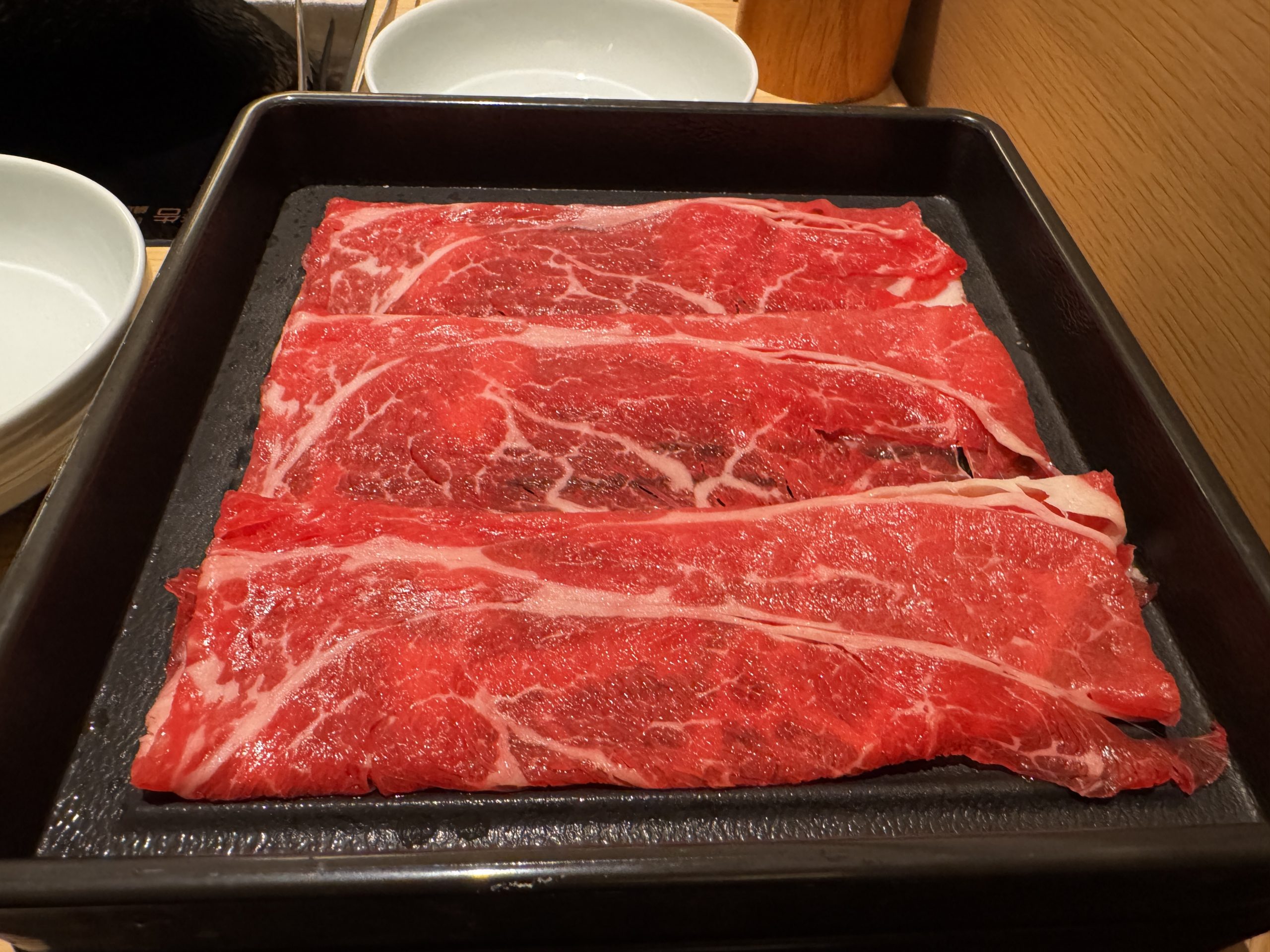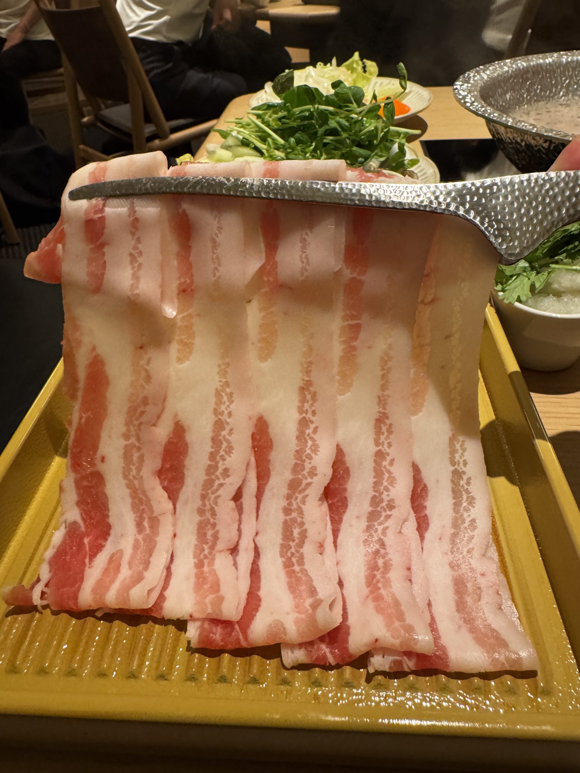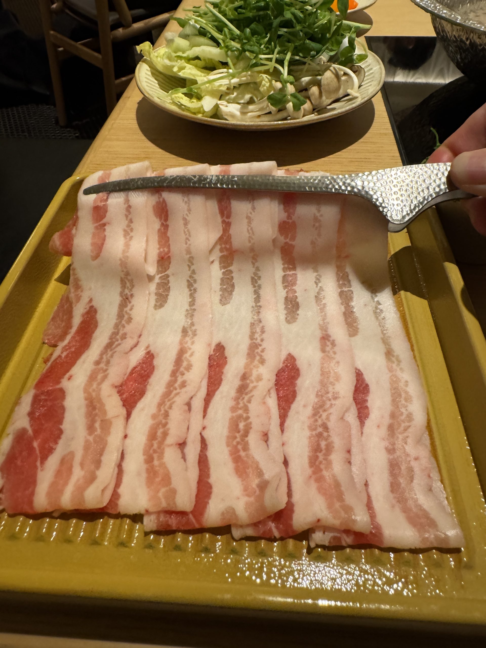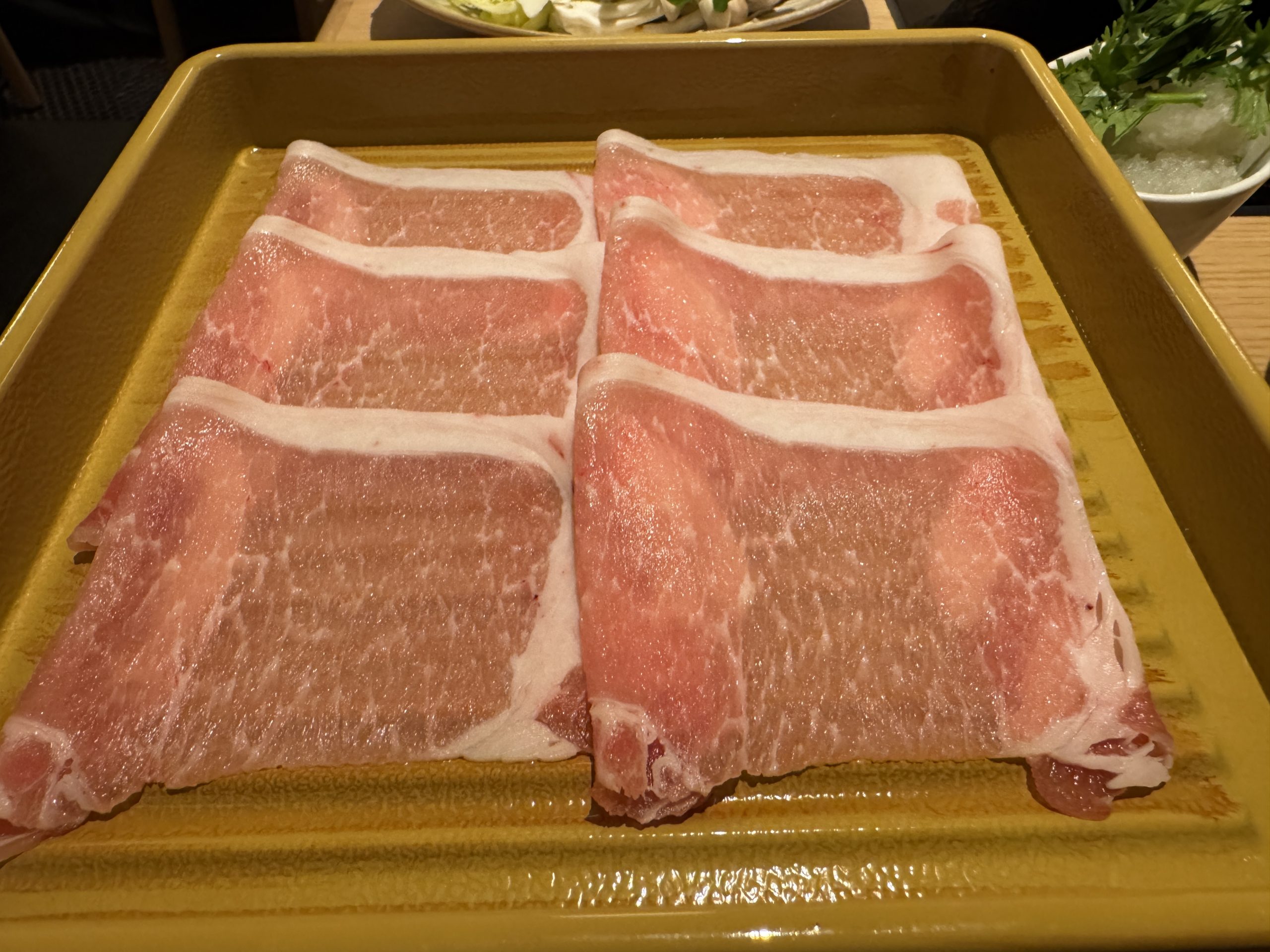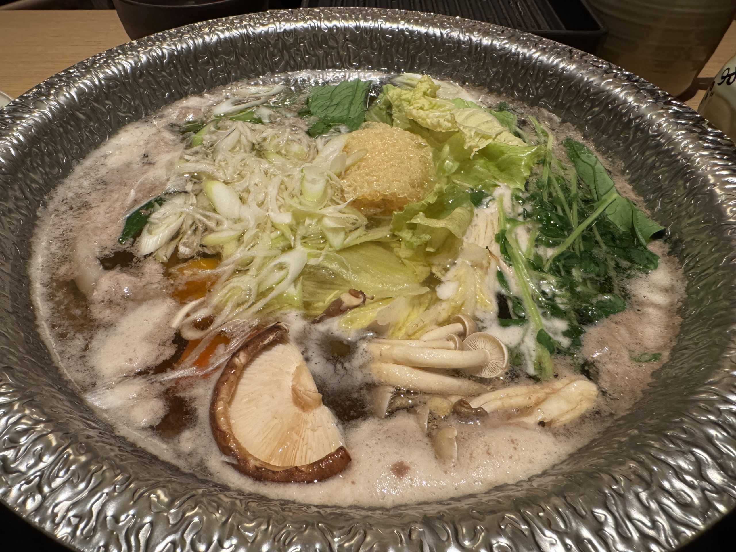 牛肩ロース、牛バラ、豚ロース、豚バラをオーダー。肉以外はセルフで皿に盛っていく。野菜は白菜、タマネギ、長ネギ、レタス、チンゲン菜、小松菜、豆苗、ニンジン、カボチャ、ヤングコーン、さつまいも、じゃがいも、れんこん、しいたけ、えのき、ヤングコーン、トマトなどほか多数。ほかにも鶏だんご、蟹だんご、玉こんにゃく、ライスヌードル、うどん、中華麺なども用意されている。