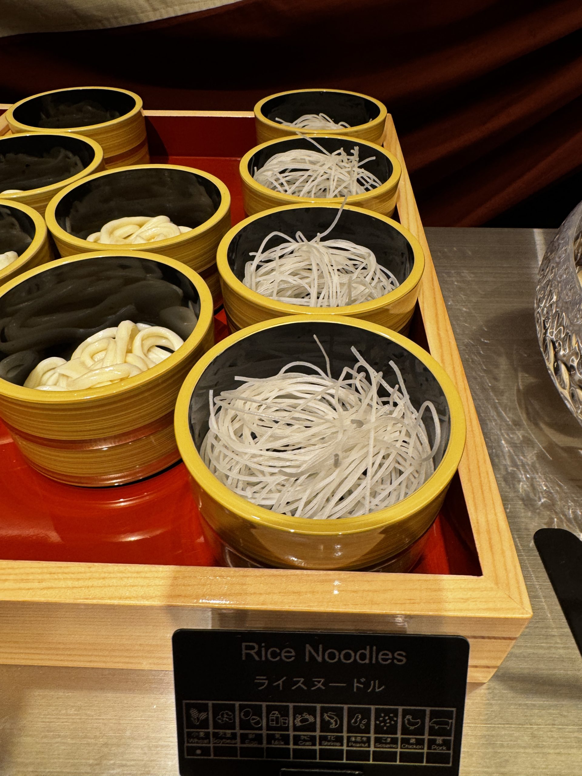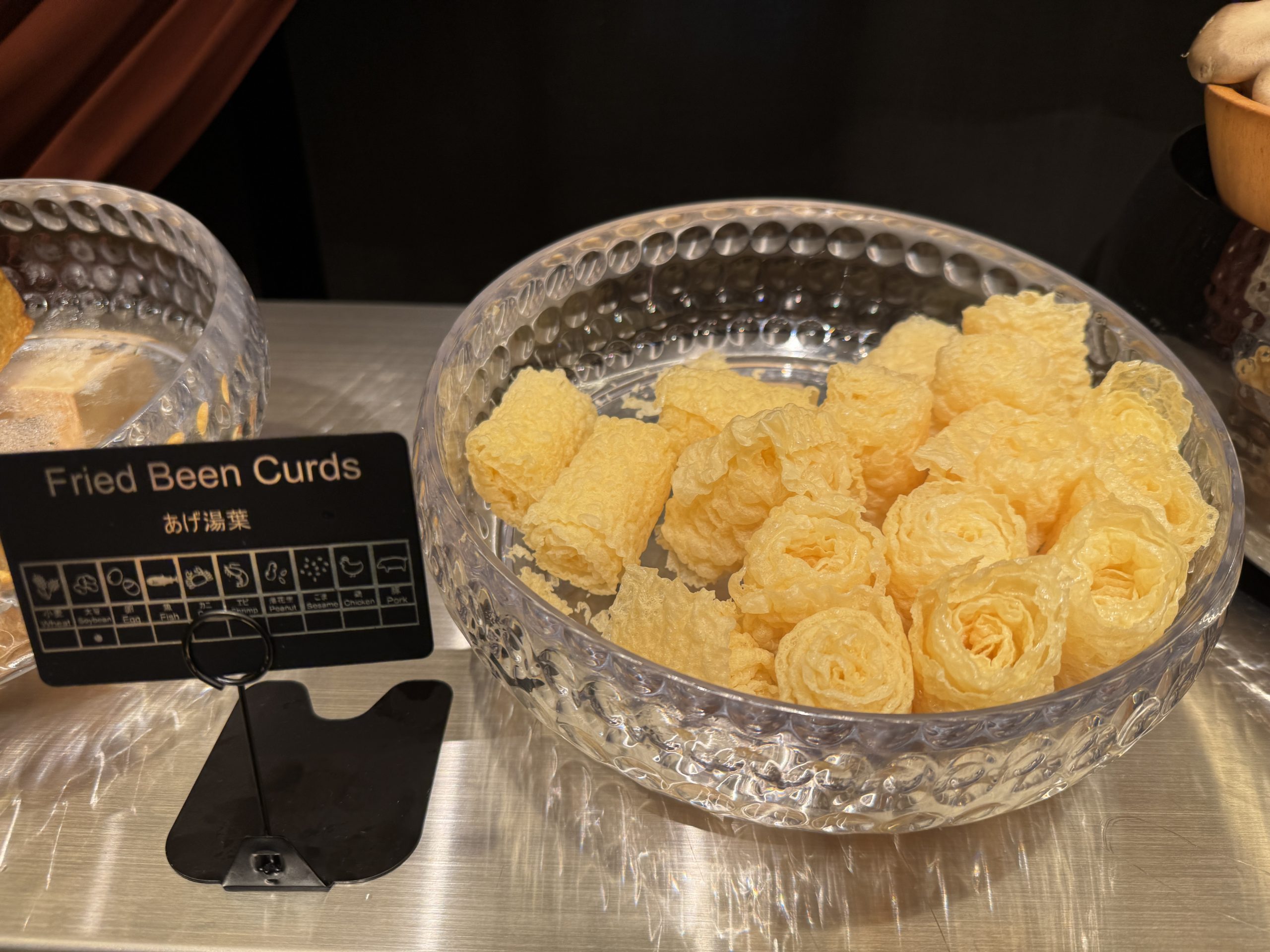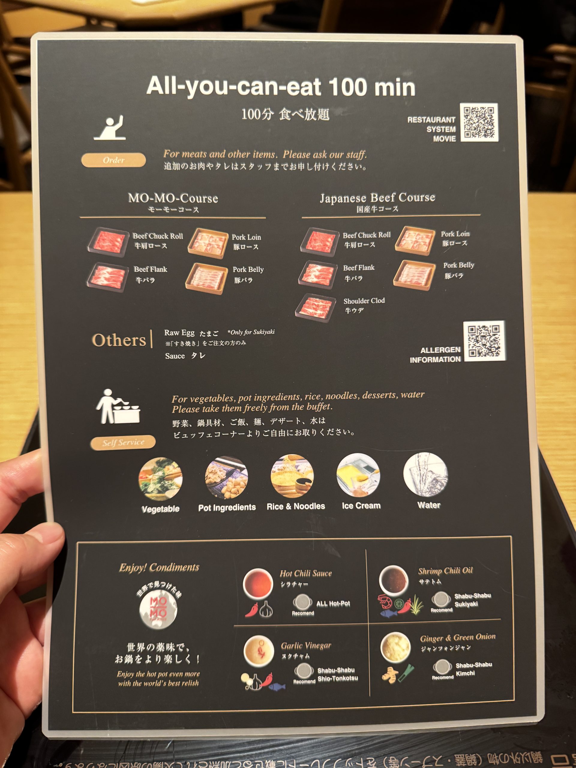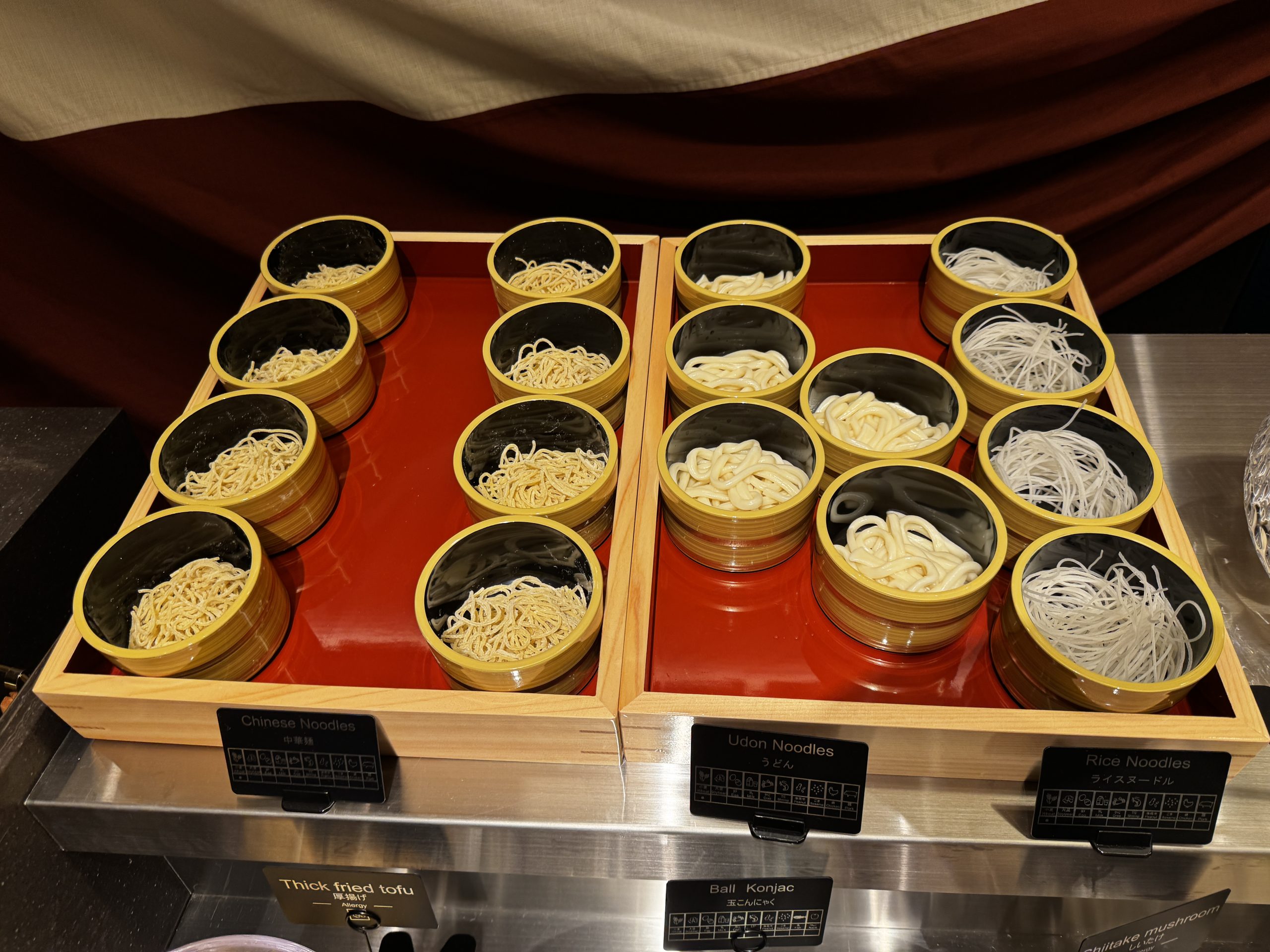 牛肩ロース、牛バラ、豚ロース、豚バラをオーダー。肉以外はセルフで皿に盛っていく。野菜は白菜、タマネギ、長ネギ、レタス、チンゲン菜、小松菜、豆苗、ニンジン、カボチャ、ヤングコーン、さつまいも、じゃがいも、れんこん、しいたけ、えのき、ヤングコーン、トマトなどほか多数。ほかにも鶏だんご、蟹だんご、玉こんにゃく、ライスヌードル、うどん、中華麺なども用意されている。
