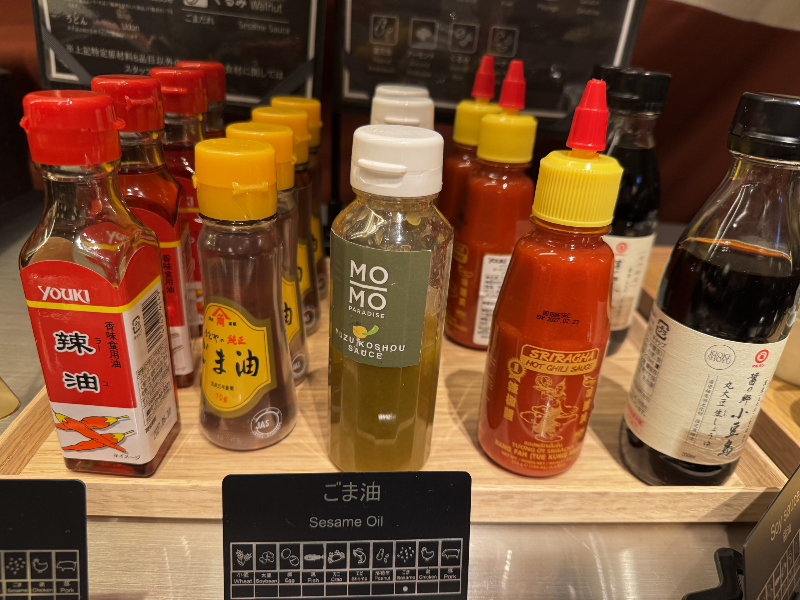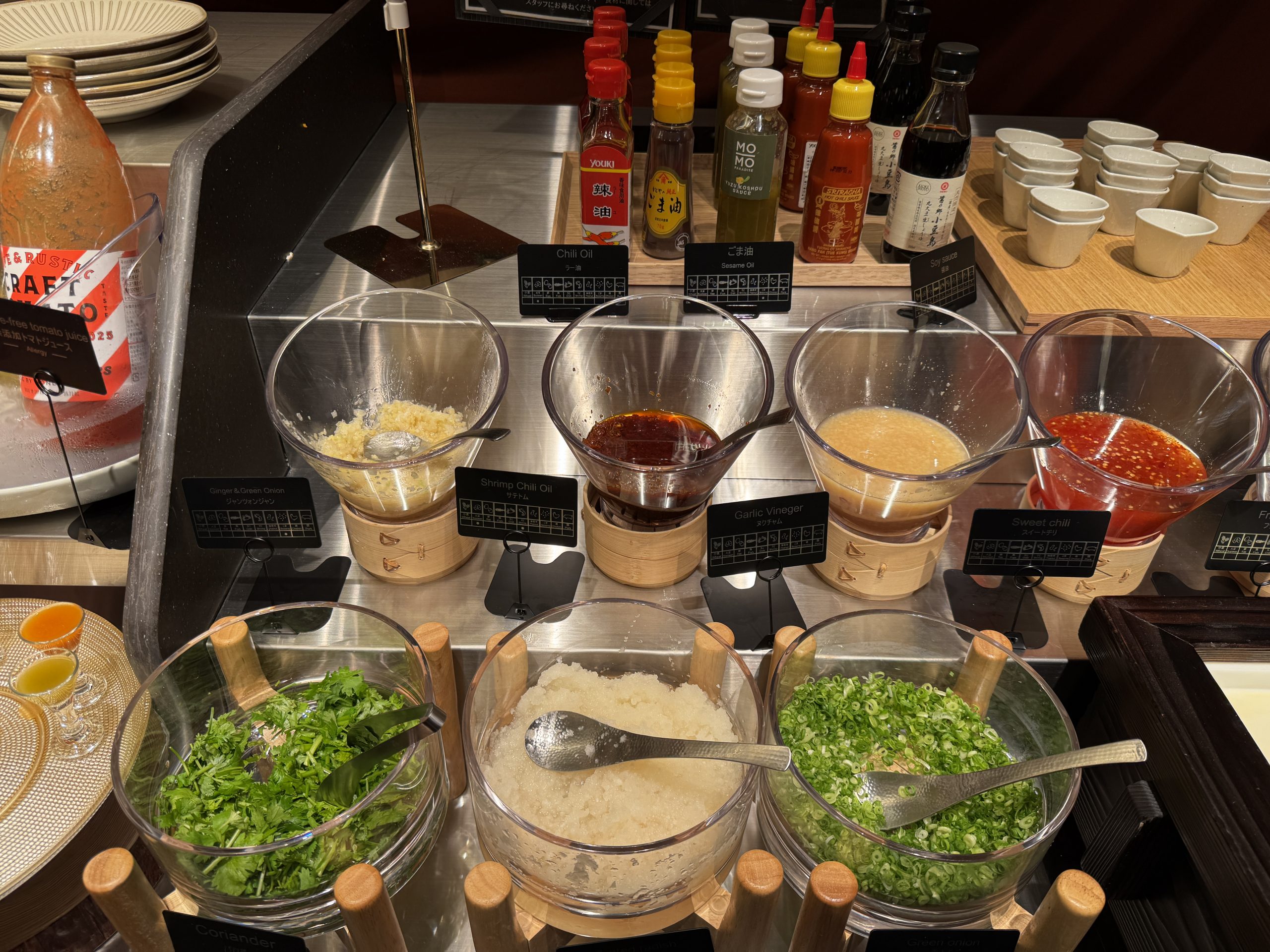タレのぽん酢とゴマダレは卓上にあり、薬味はセルフサービスコーナーにある。ライスや野菜やアイスクリームなどもすべてセルフサービスコーナー。