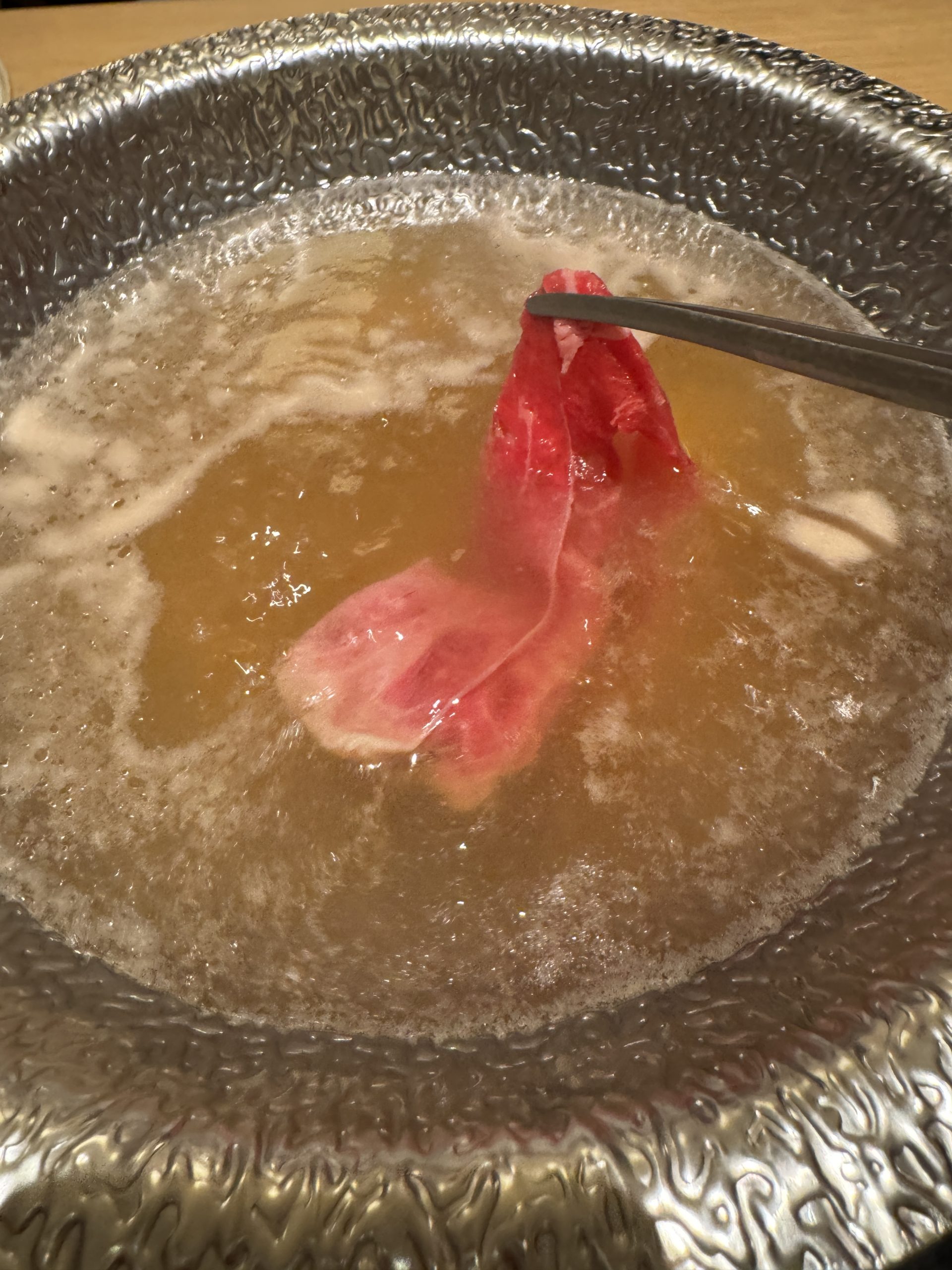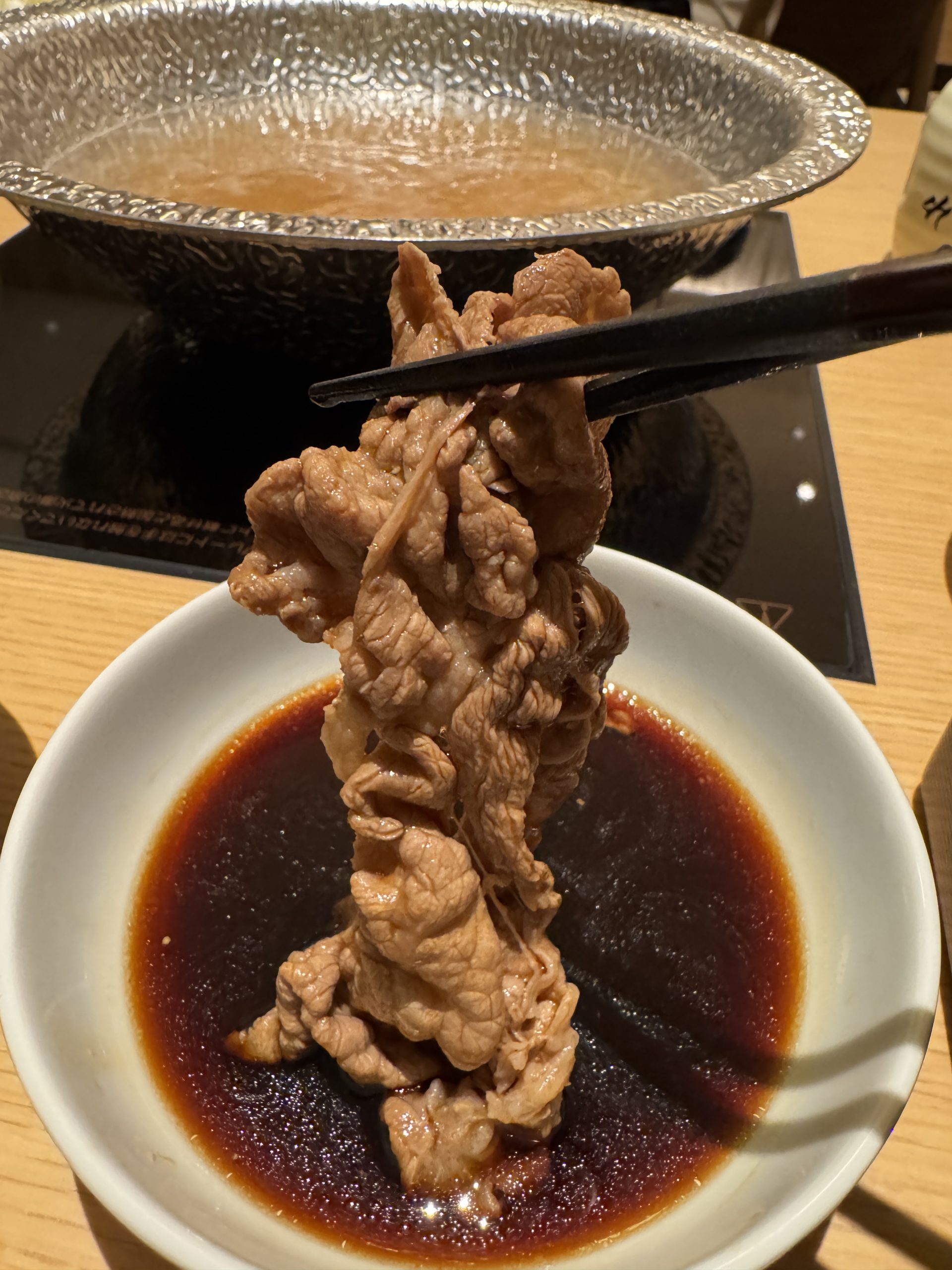 筆者が好きな食べ方は、肉一皿分を一気に鍋に入れて加熱する方法。鍋に入れたすべての肉を一気にぽん酢に浸し、ガッ! と大量に食べる。