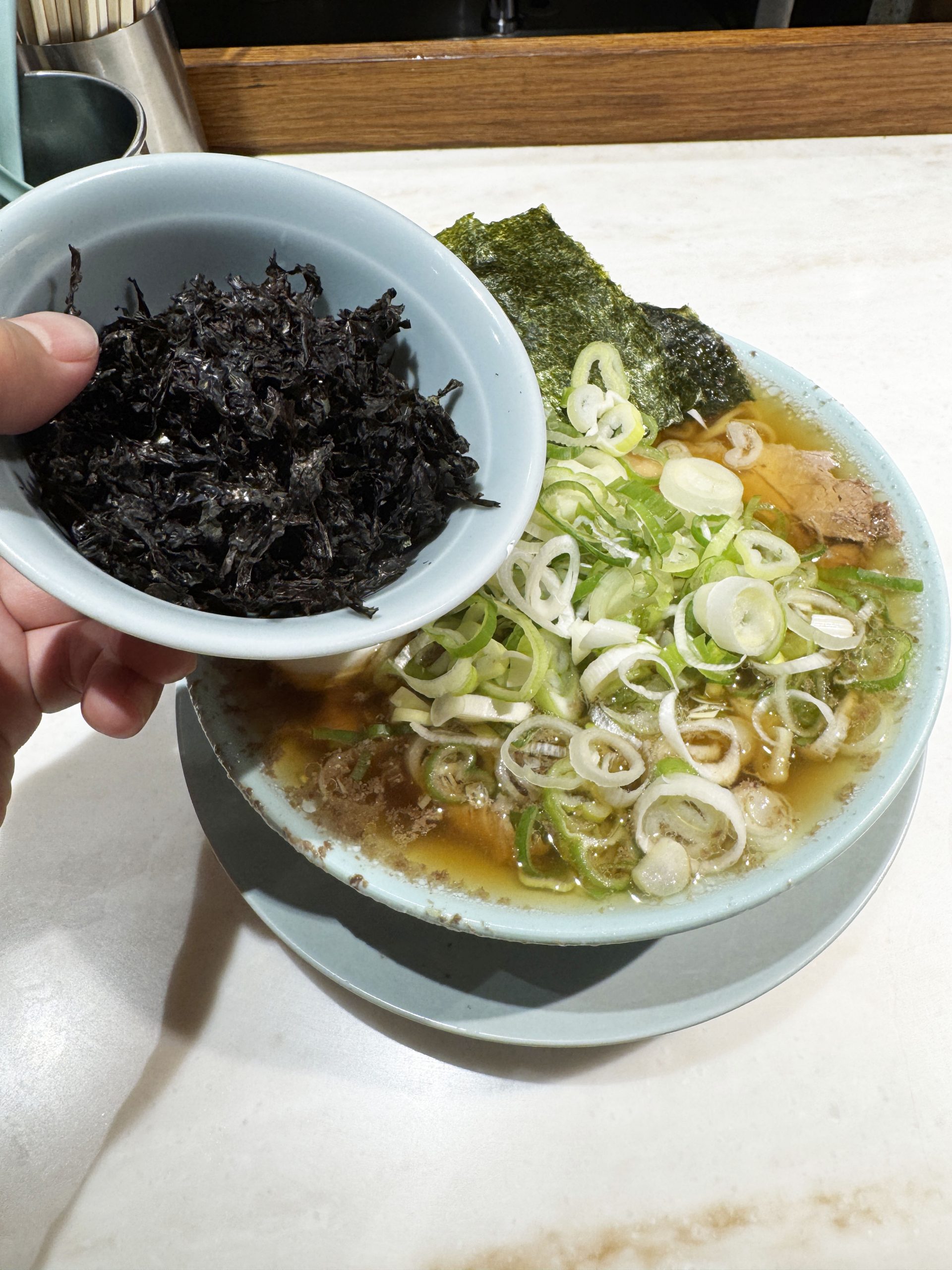 ネギたっぷりの中華そばに、別の器に用意された岩ノリをかけて食べる。けっこう岩ノリの量は多いが、可能なら、岩ノリ2~3杯はかけたいところ。