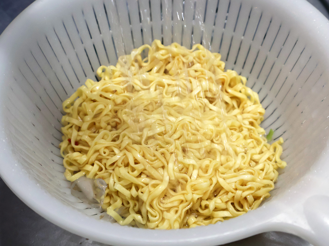 スープと具材はなるべくカップの中に残るようにしながら麺だけをピックアップ! よしっ! そして麺は流水+氷でキンキンに冷やし、スープは鍋で再加熱してアツアツ&濃厚化!