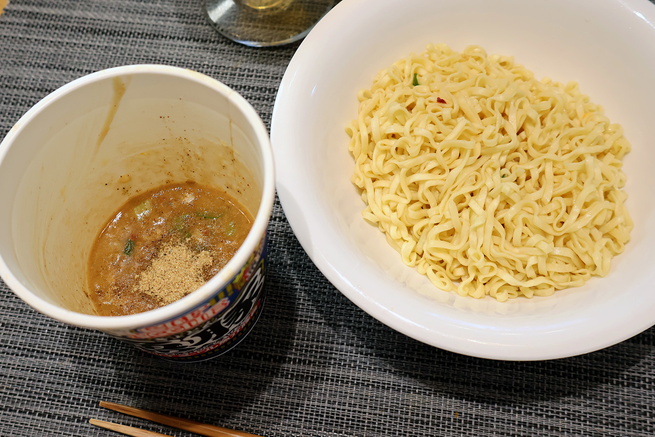 カップヌードルの麺を冷やす機会なんてなかなかないものだけど、いざ冷やしてみるといい感じにプリッとハリが出るんですな。そのまま食べるのとはまったくの別物。そしてつけ汁の濃厚さも大幅アップし「カップヌードル 魚豚」の魅力も最大限に引き立てられている感が……!