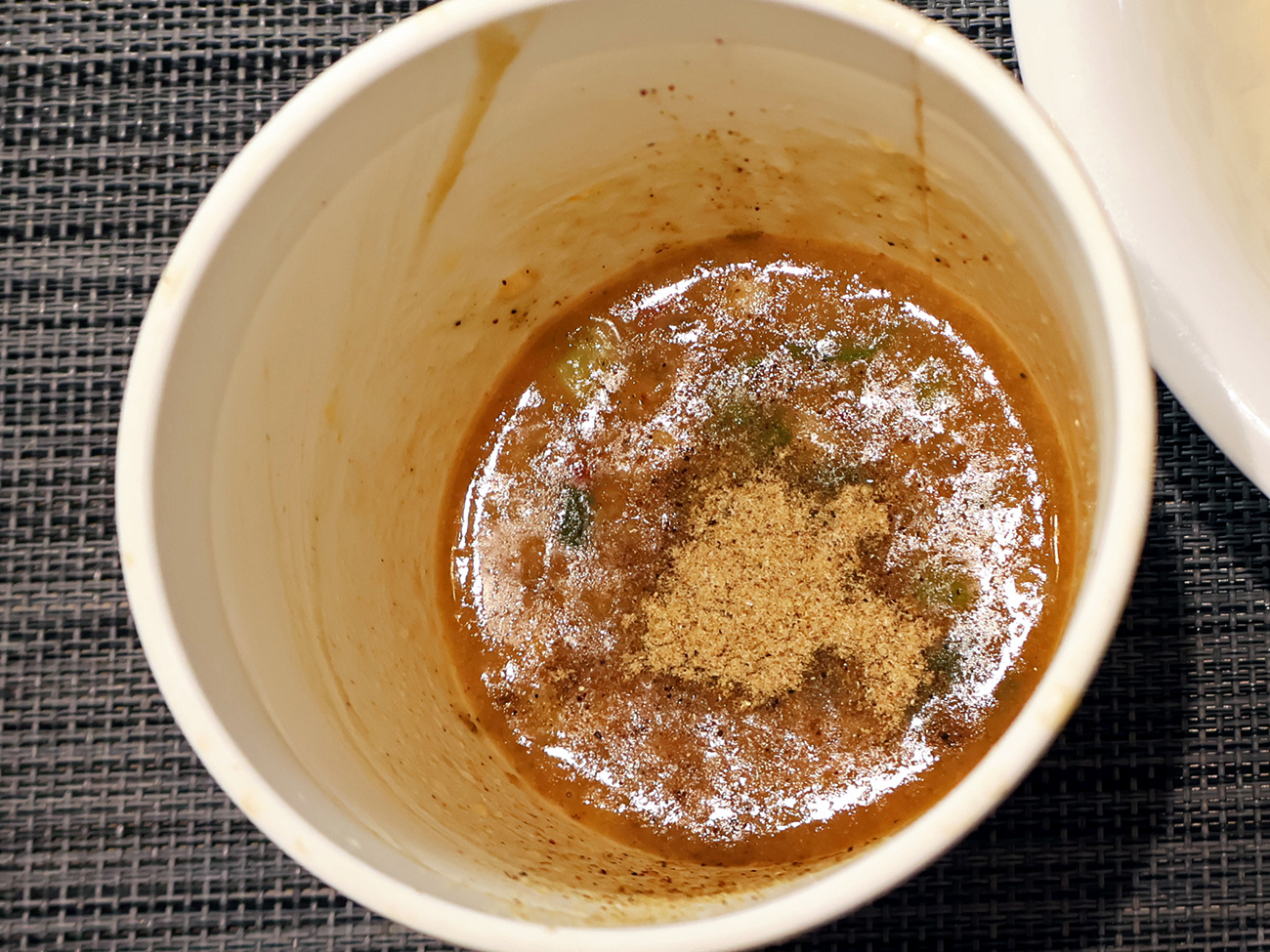 スープはお湯少なめで作り、しかも軽く煮詰めたため、かなりドロドロの濃厚な状態に仕上がっています。これはもはやスープではなく完全につけ汁! 特に材料などを足したりせずに「カップヌードル 魚豚」の完全なるつけ麺化に大成功!!