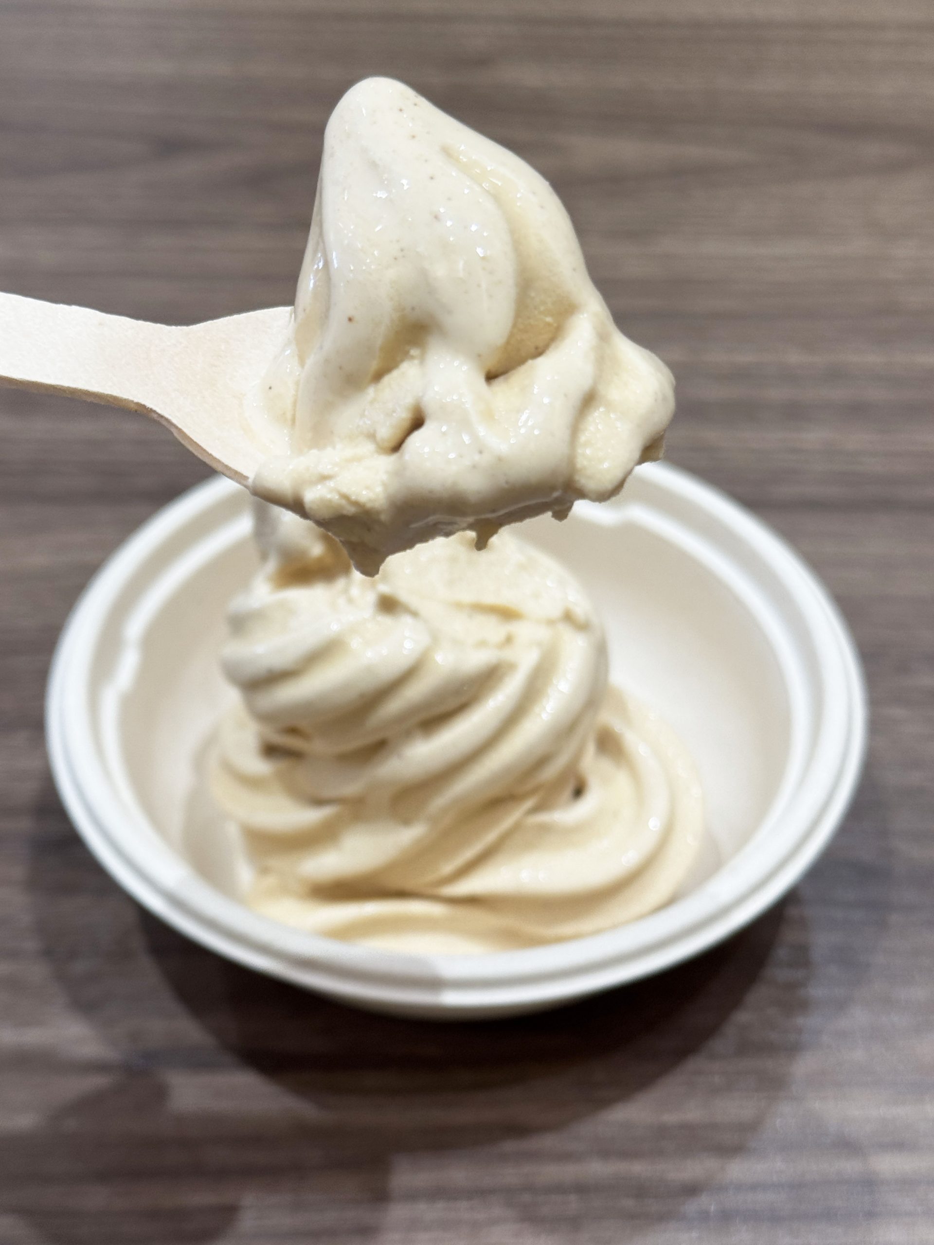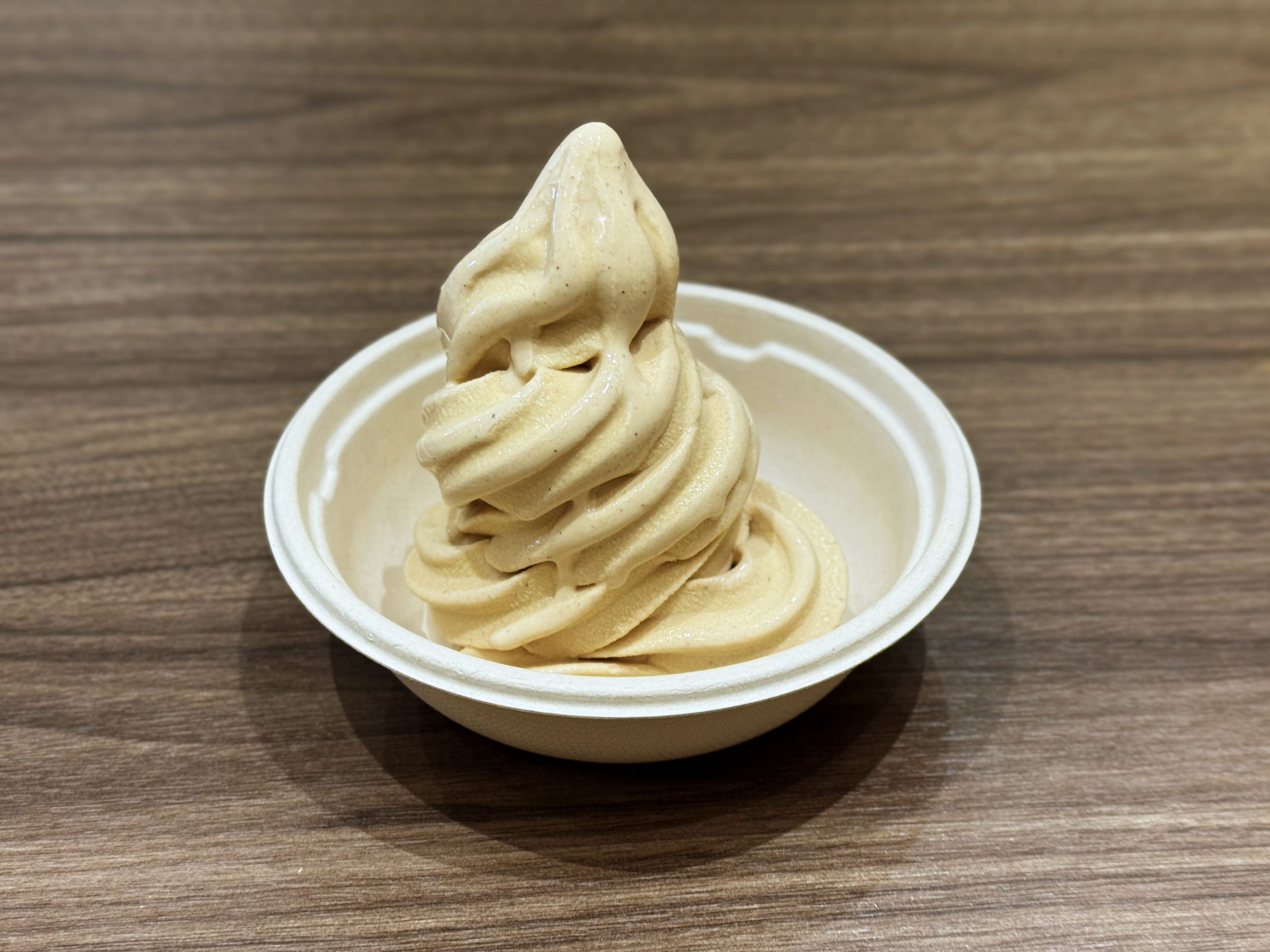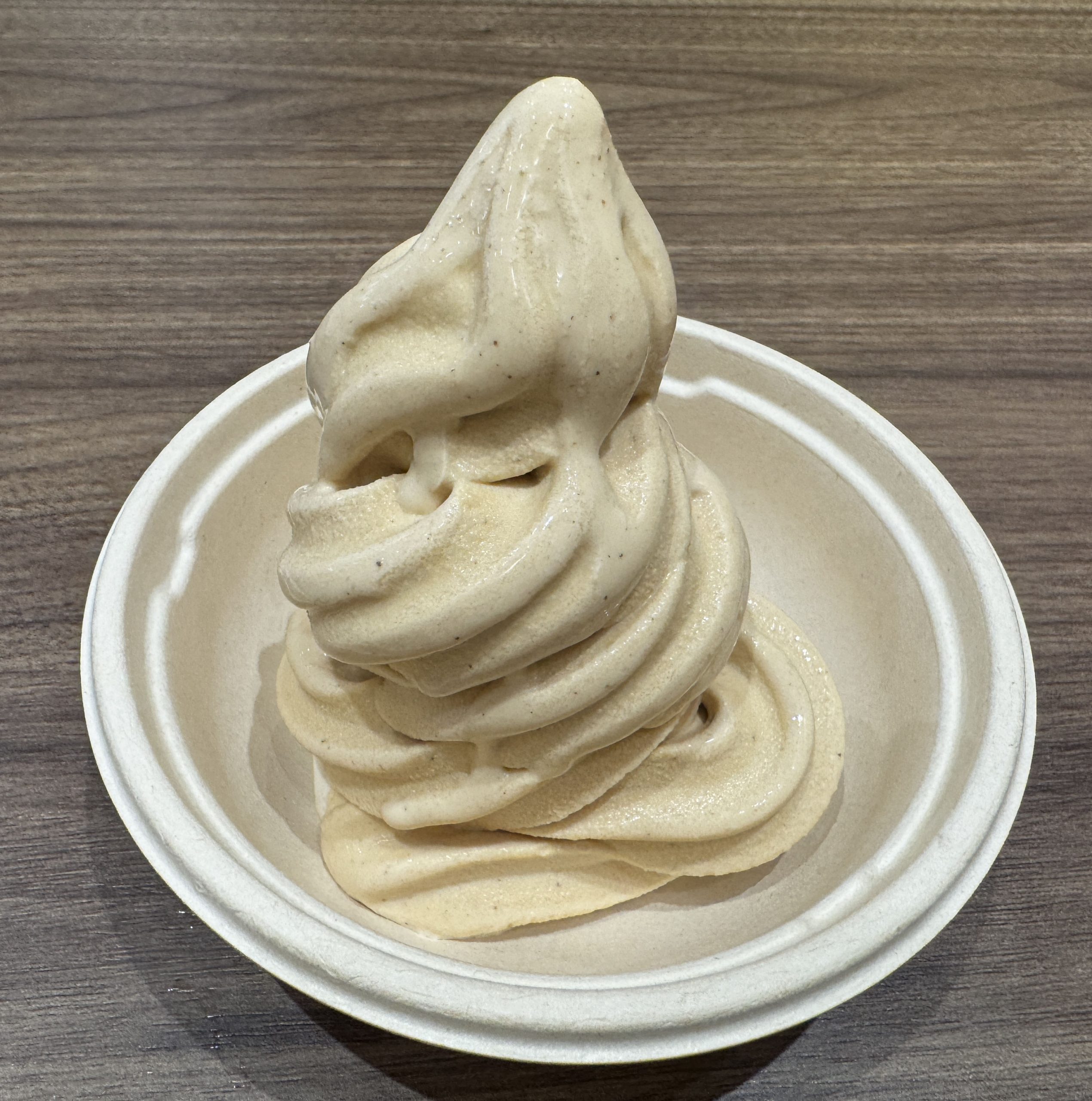 ビジュアルは、かなり濃い印象をうけるが、実際に食べるとスッキリ。このチャイソフトクリームの良い点は、スッキリだけど、しっかりとソフトクリームとしてのまろやかさとコクを楽しませてくれる点。食べ終え後の満足度は平均以上。
