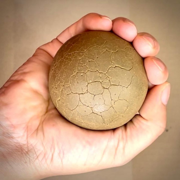 金属にしか見えないのこの球も「泥だんごです。粘土と砂と水を丸めて鉛筆の芯の粉(グラファイト)を塗り磨いて仕上げました。完成までに2日かかります。SNSでは“信じられない!”という大きな反響をいただきました」と説明してくれました。