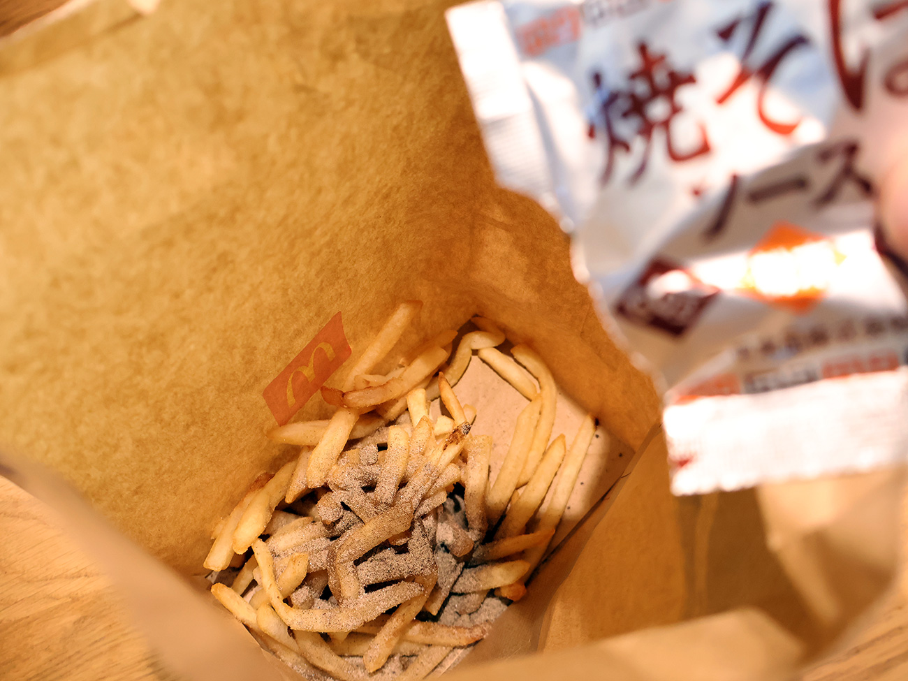 焼きそばソースを振りかけて際立つのはスパイシーさ。これがマックフライポテトの美味しさをいい感じに底上げしてくれるのです。ジャンクなようで、意外とお酒にも合うオトナな味。もう、めちゃくちゃうまい!