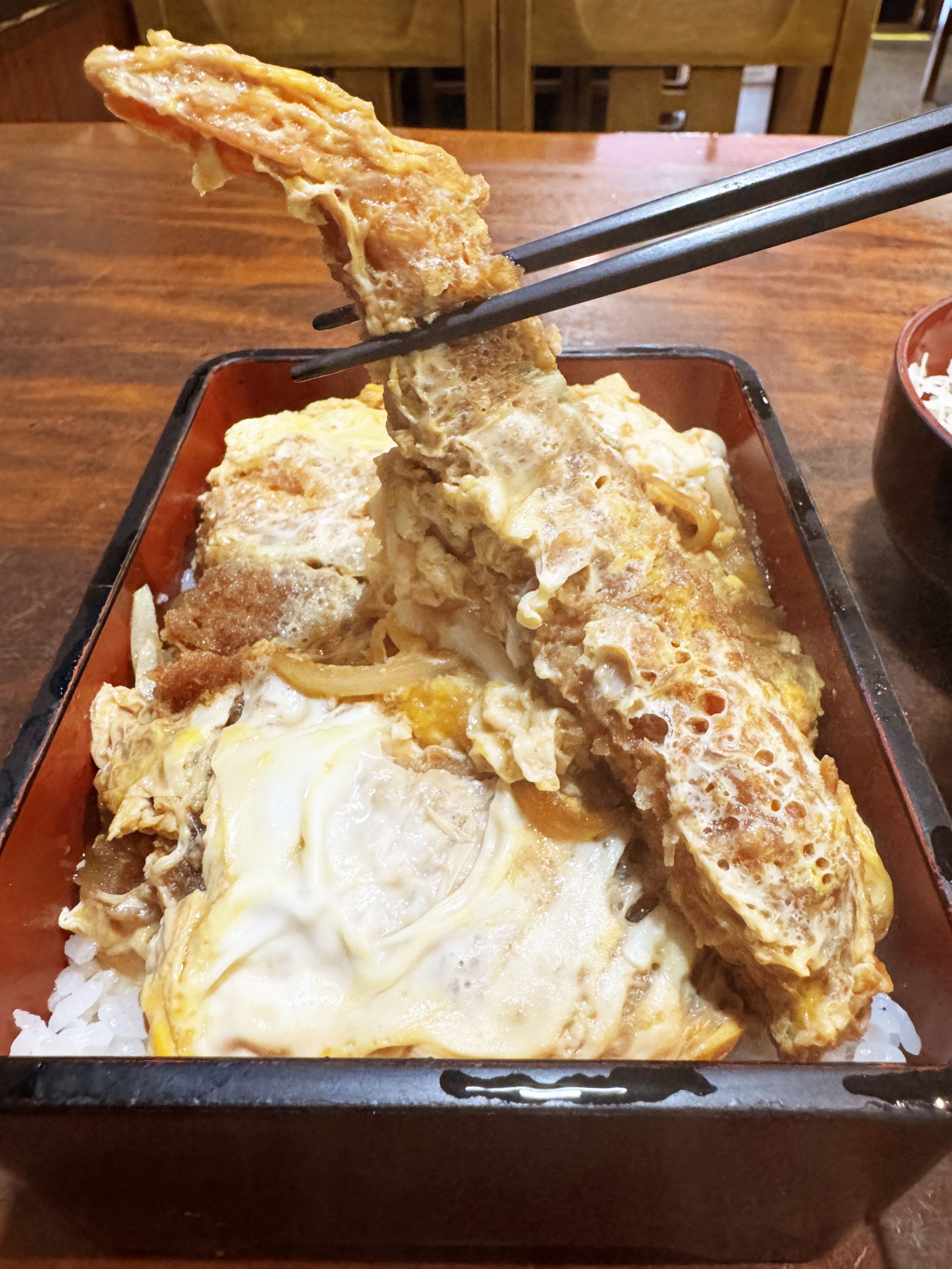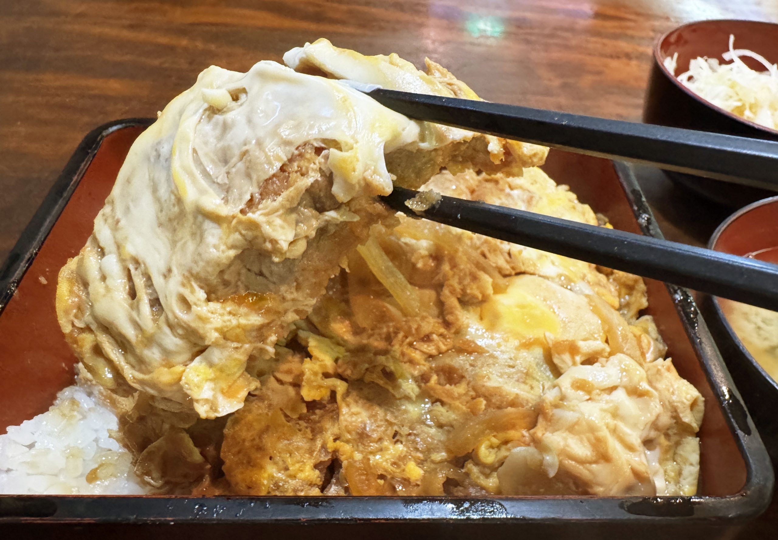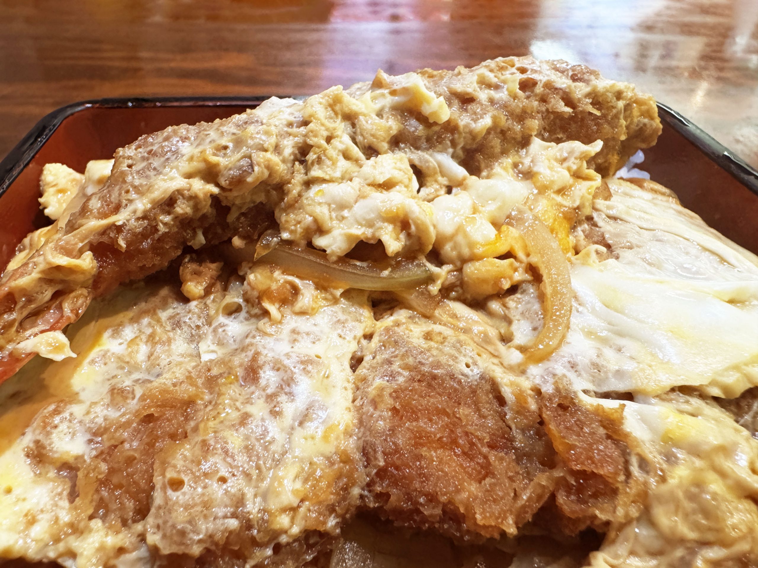 玉子と旨味たっぷりタレによって、エビフライとトンカツが一体化しています。