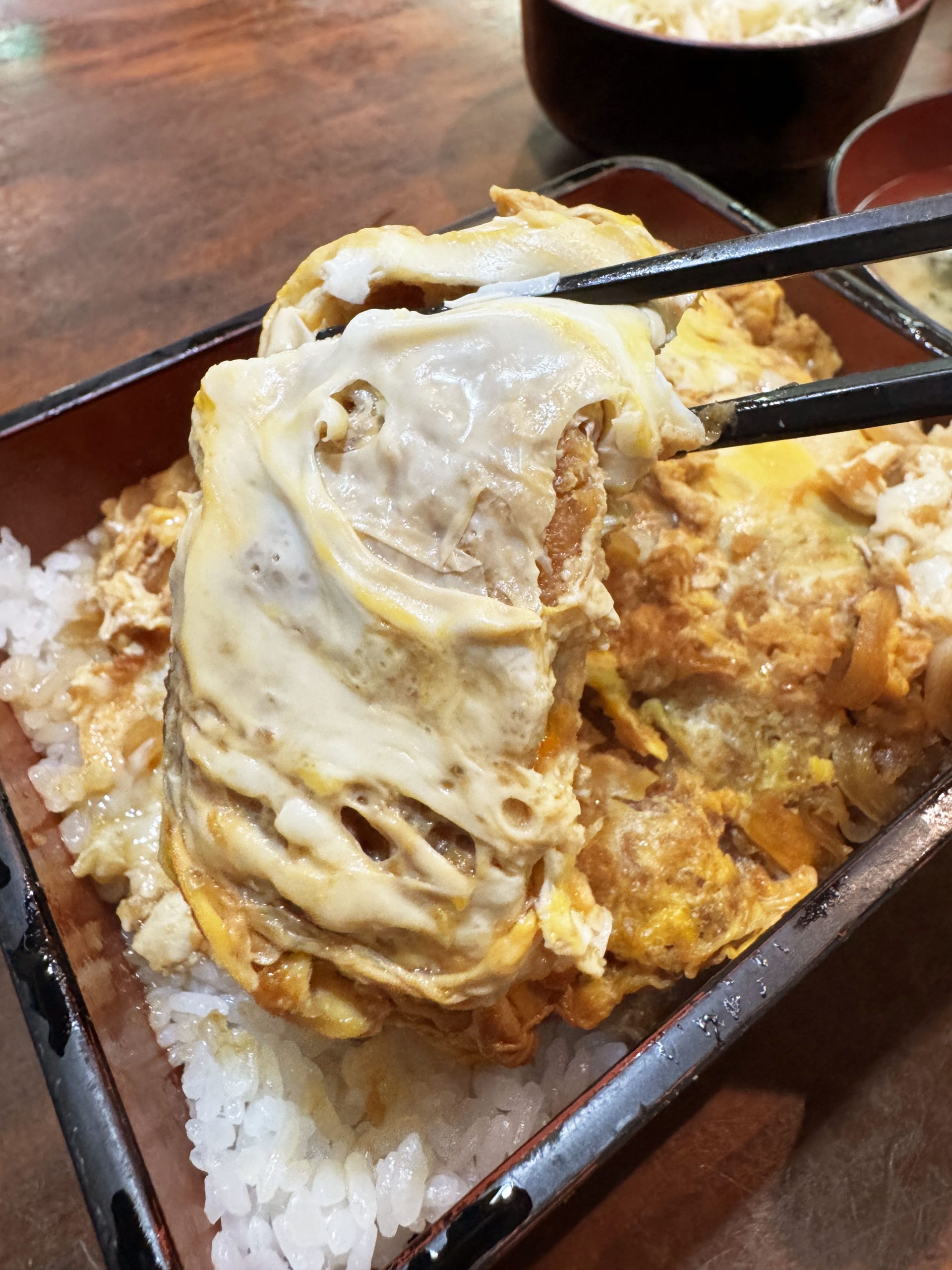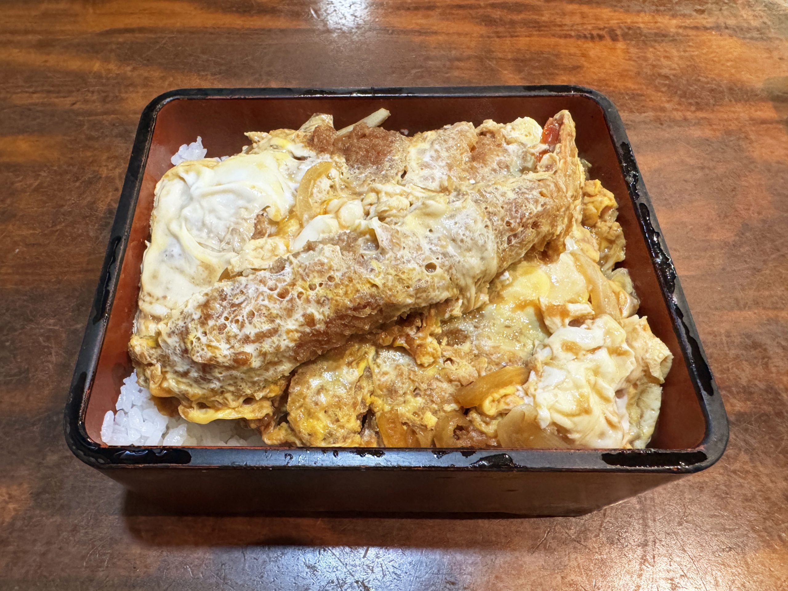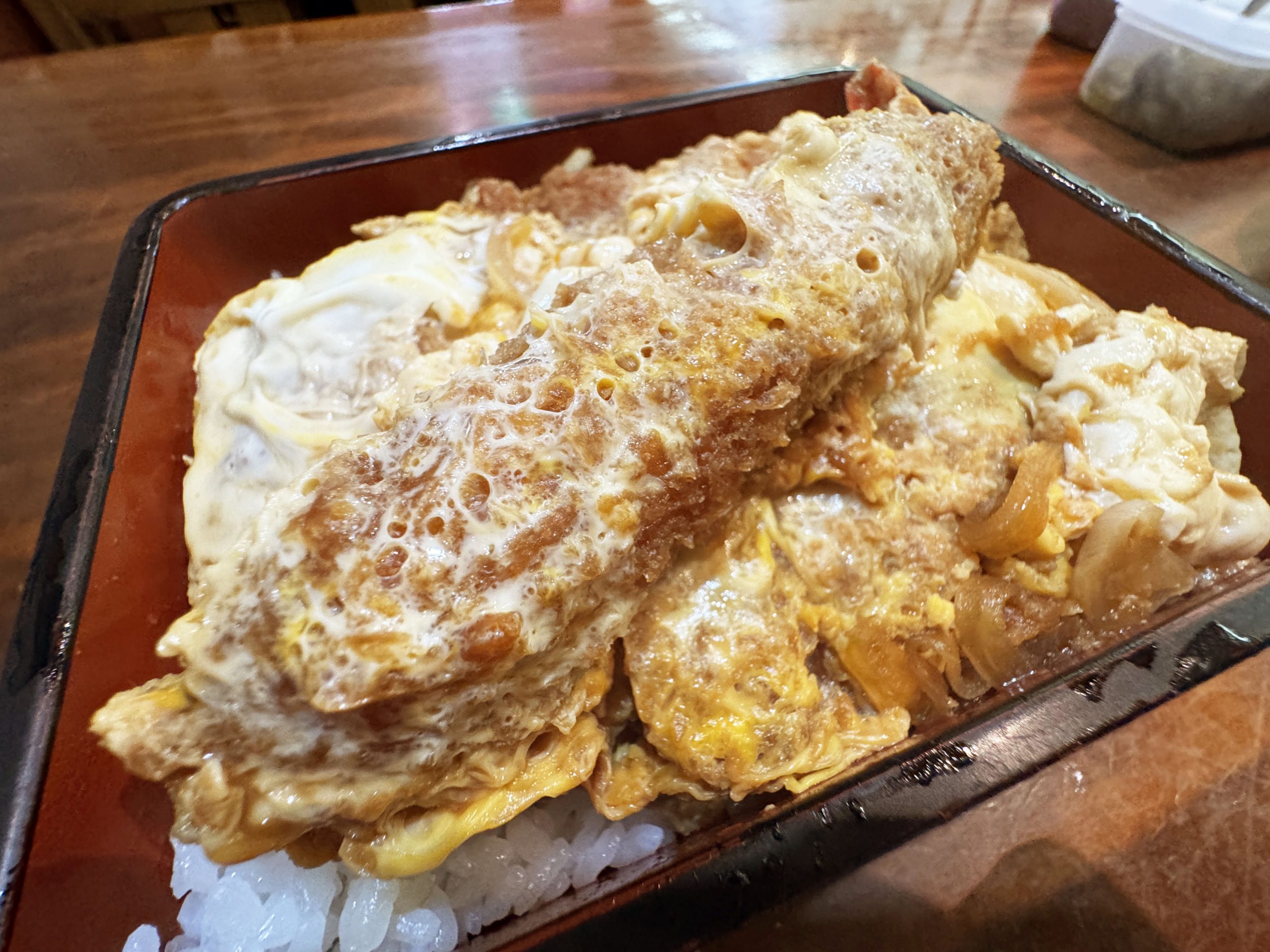 玉子と旨味たっぷりタレによって、エビフライとトンカツが一体化しています。