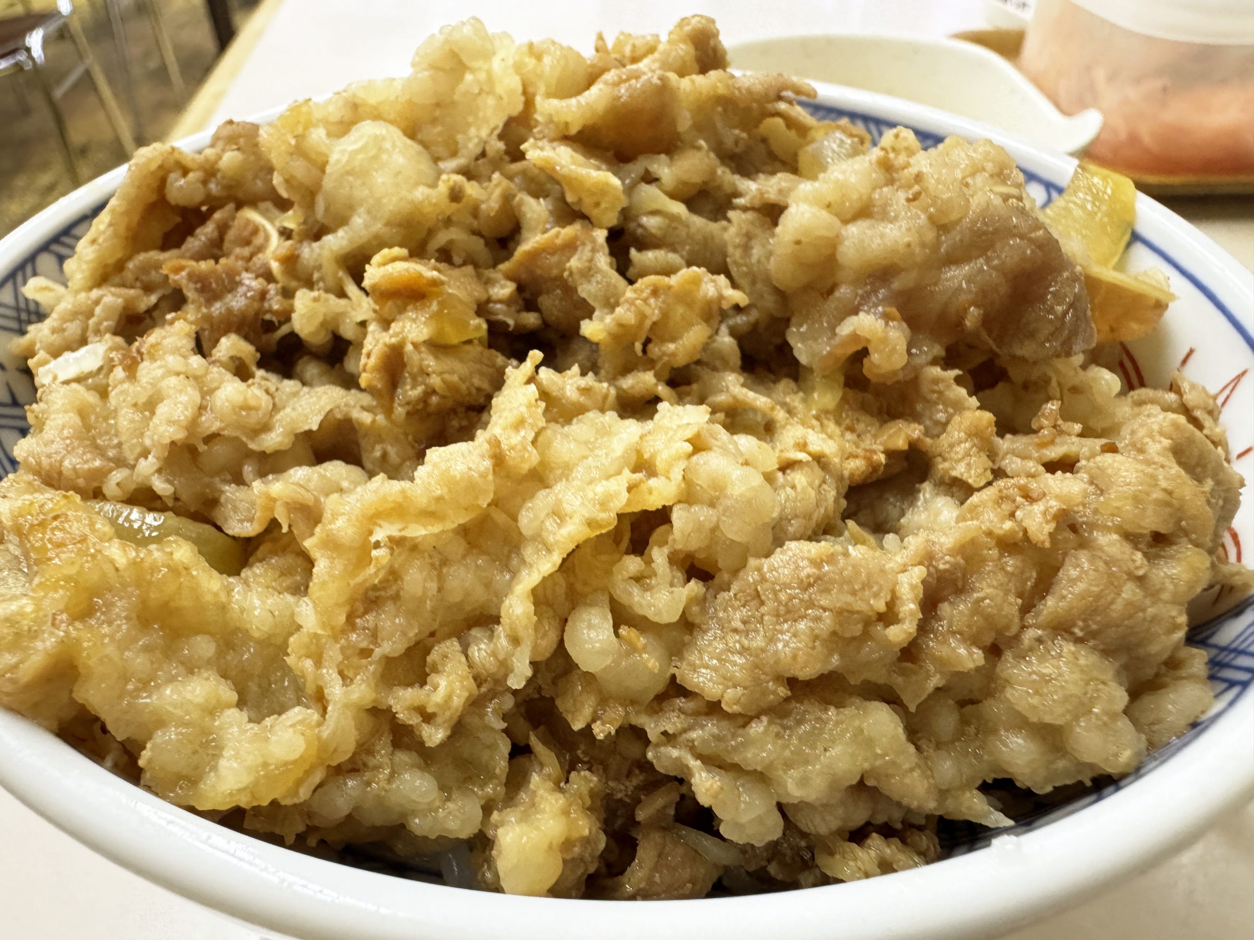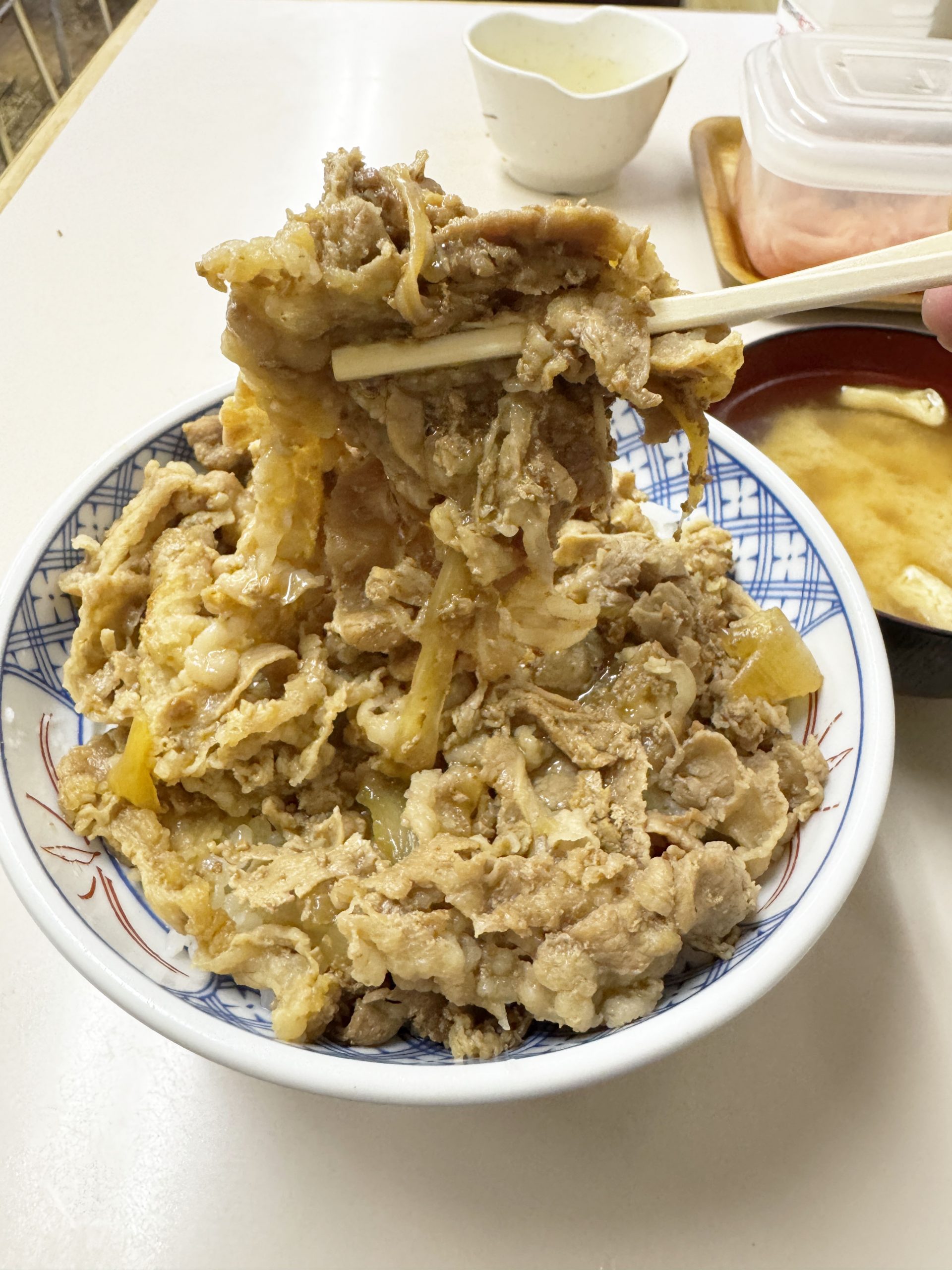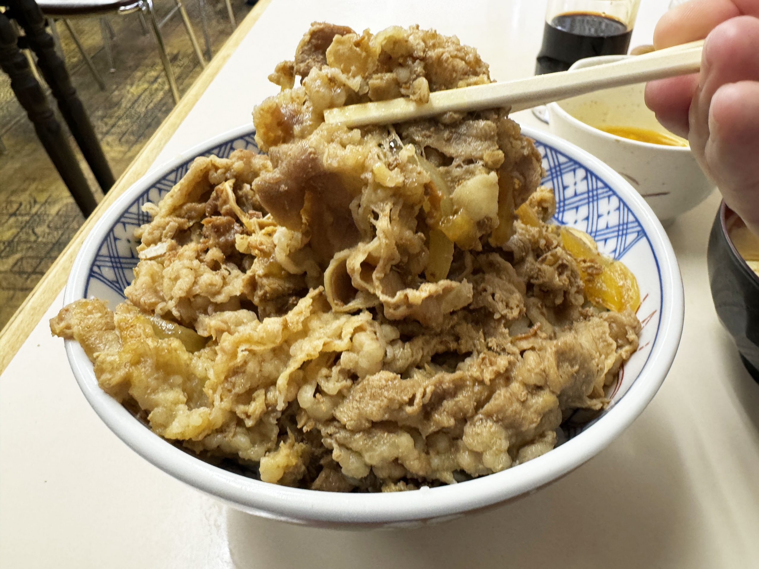 エモーショナルな話になるが、サンボの店員さんがテーブルに牛丼を運んできた時点で、エモさを強く感じる。いまサンボにいるんだなって、メンタル面でも強く感じる。感覚の目でよーく見ればわかる。牛丼の完成度が高いだけでなく、店員さんが運ぶことによっておいしさが極まると。