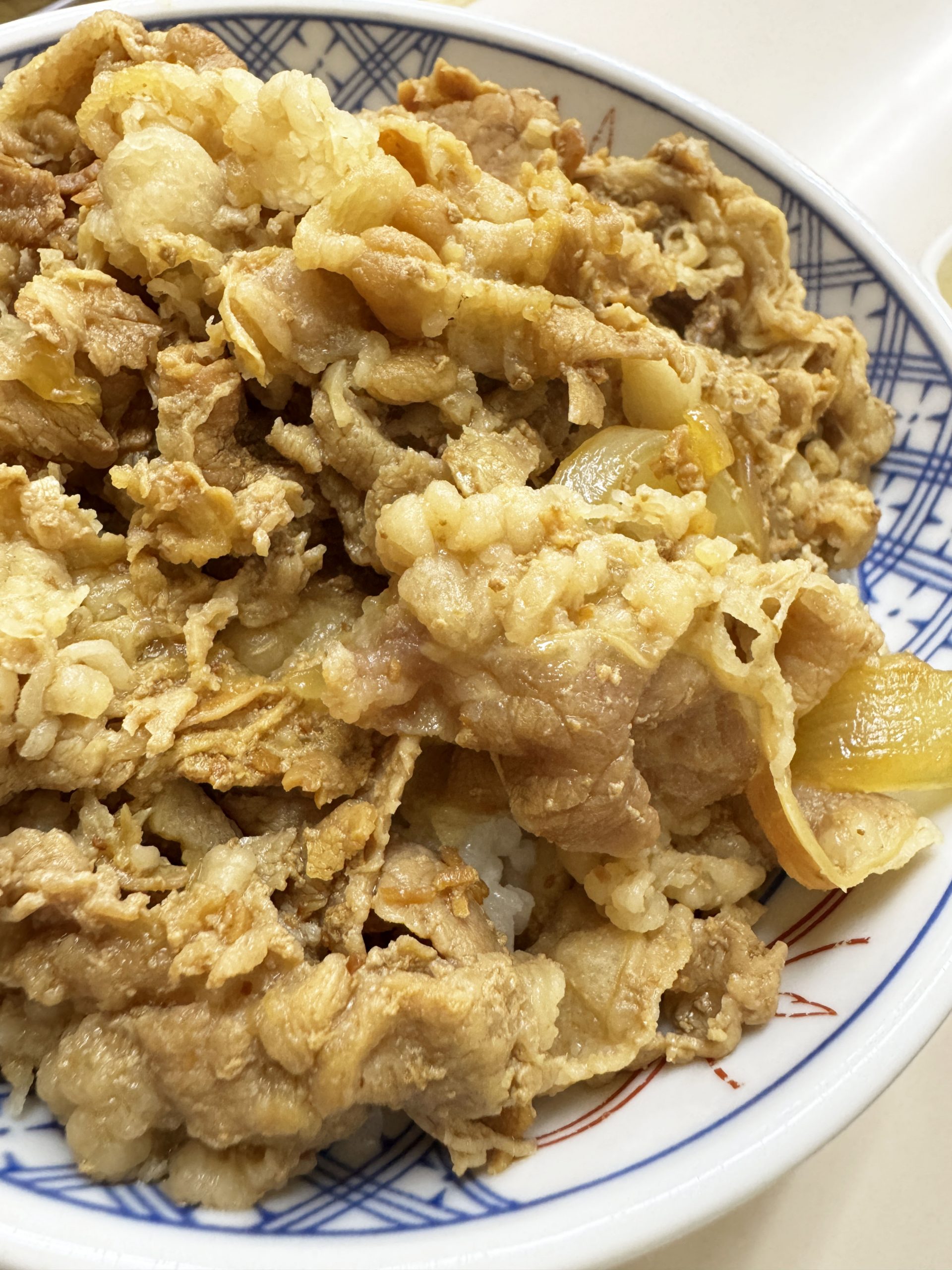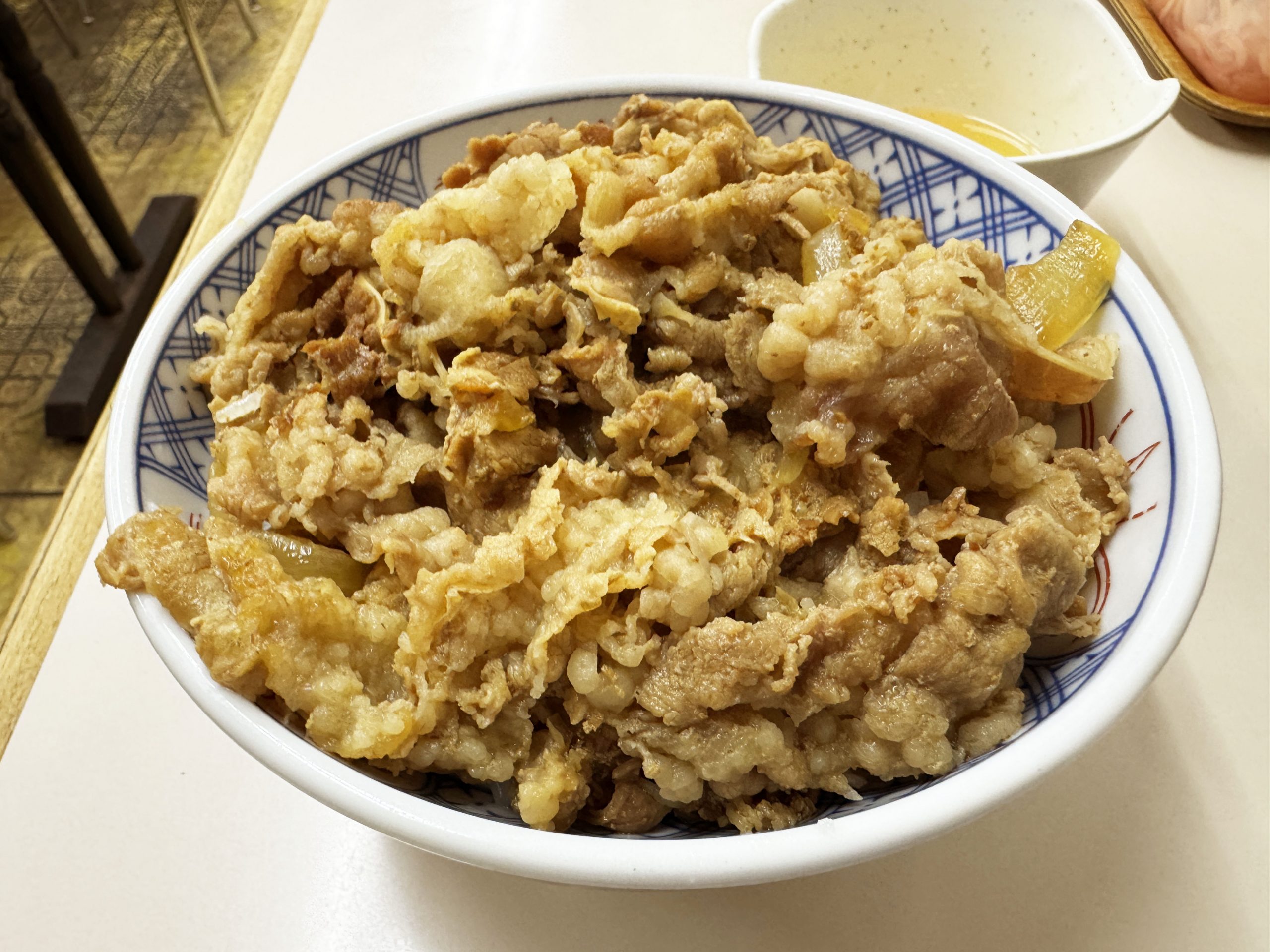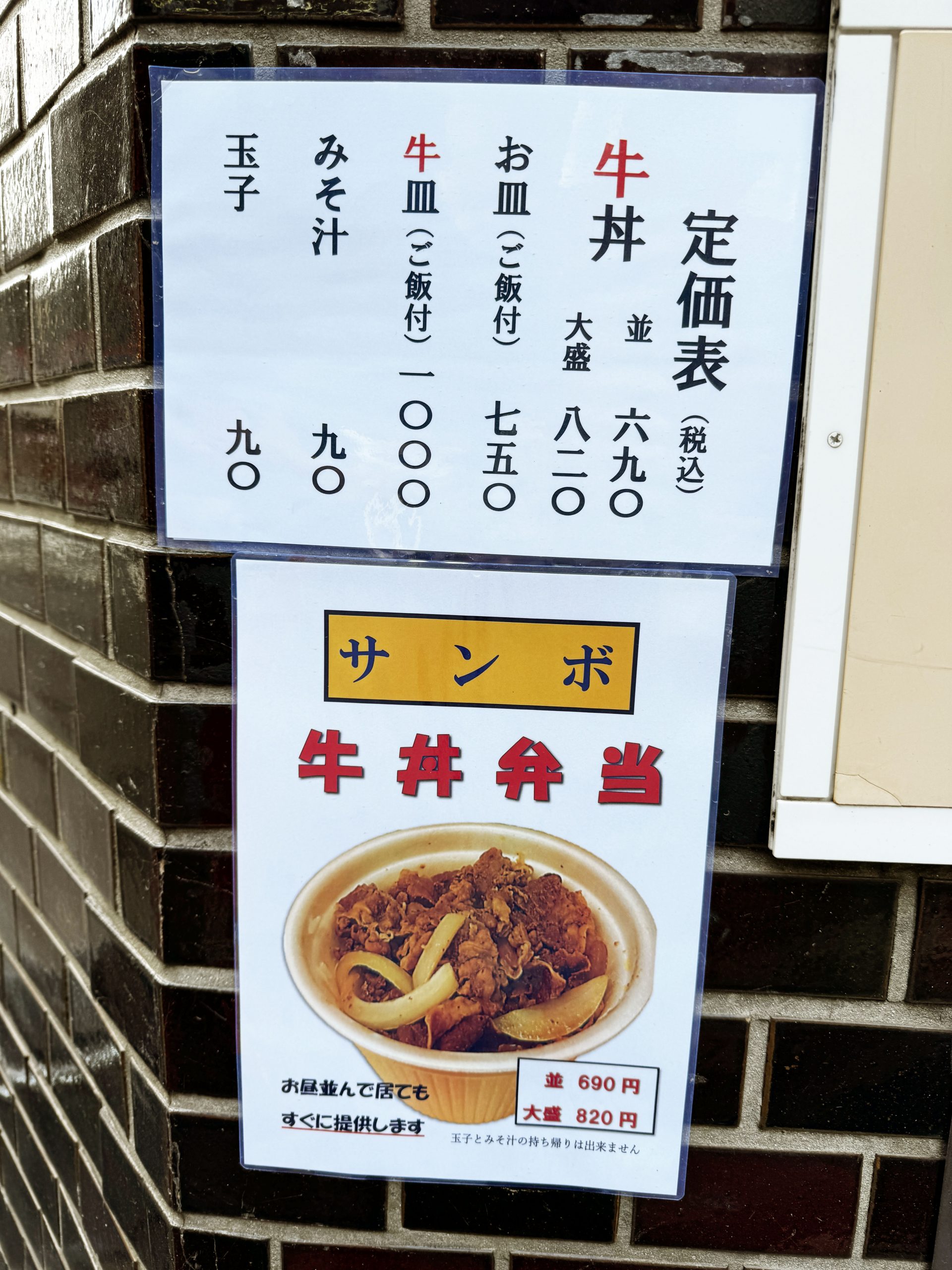 エモーショナルな話になるが、サンボの店員さんがテーブルに牛丼を運んできた時点で、エモさを強く感じる。いまサンボにいるんだなって、メンタル面でも強く感じる。感覚の目でよーく見ればわかる。牛丼の完成度が高いだけでなく、店員さんが運ぶことによっておいしさが極まると。