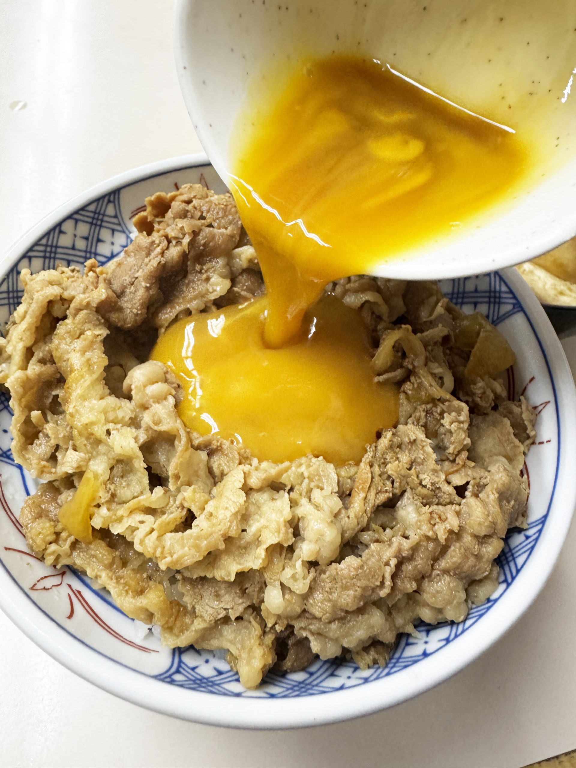そして、中盤から、生卵をかけて食べる。生卵には醤油をやや多めに入れて、牛丼をパワフルでエネルギッシュなテイストにクラスチェンジさせる。サンボの「優しさ」と「ワイルドさ」の双方を楽しめるからだ。ちょっと過剰に塩味強めにしたボヘミアンなテイストも最高。