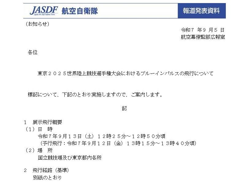 航空自衛隊のアクロバット飛行チーム「ブルーインパルス」が「東京2025世界陸上競技選手権大会」東京開催を記念して展示飛行を行います。