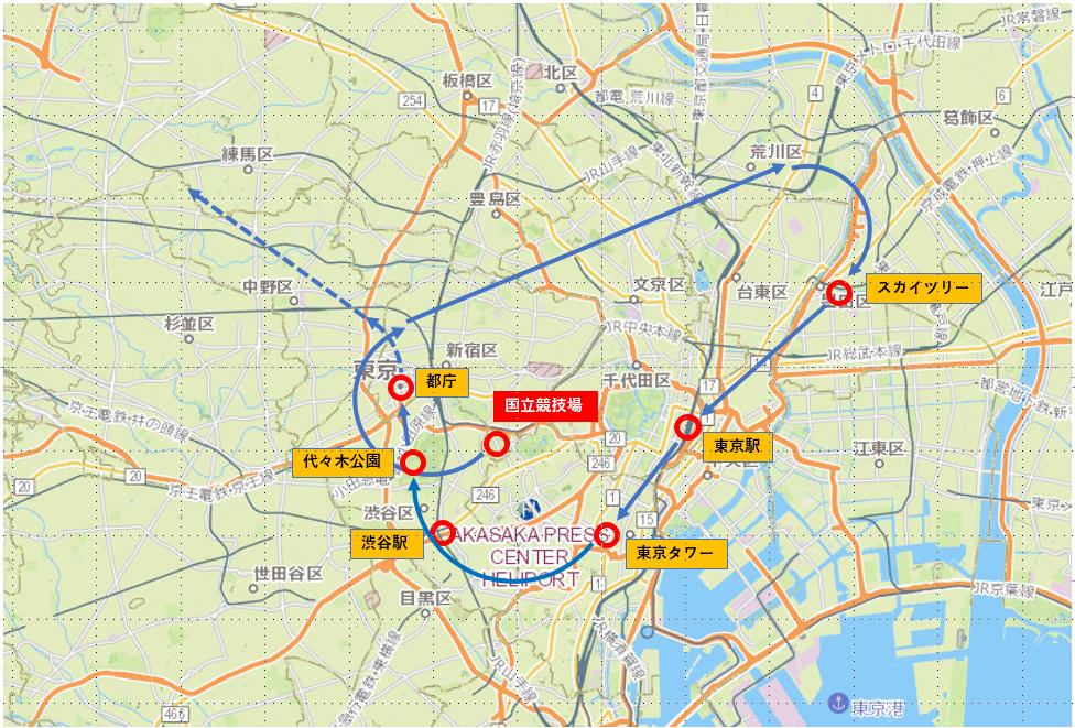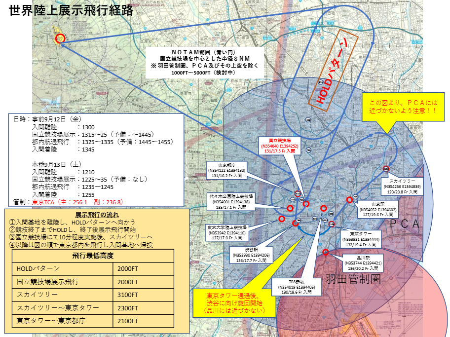 入間基地~国立競技場~スカイツリー~東京タワー~東京都庁~入間基地前日の9/12(金)には予行フライトが予定されています。