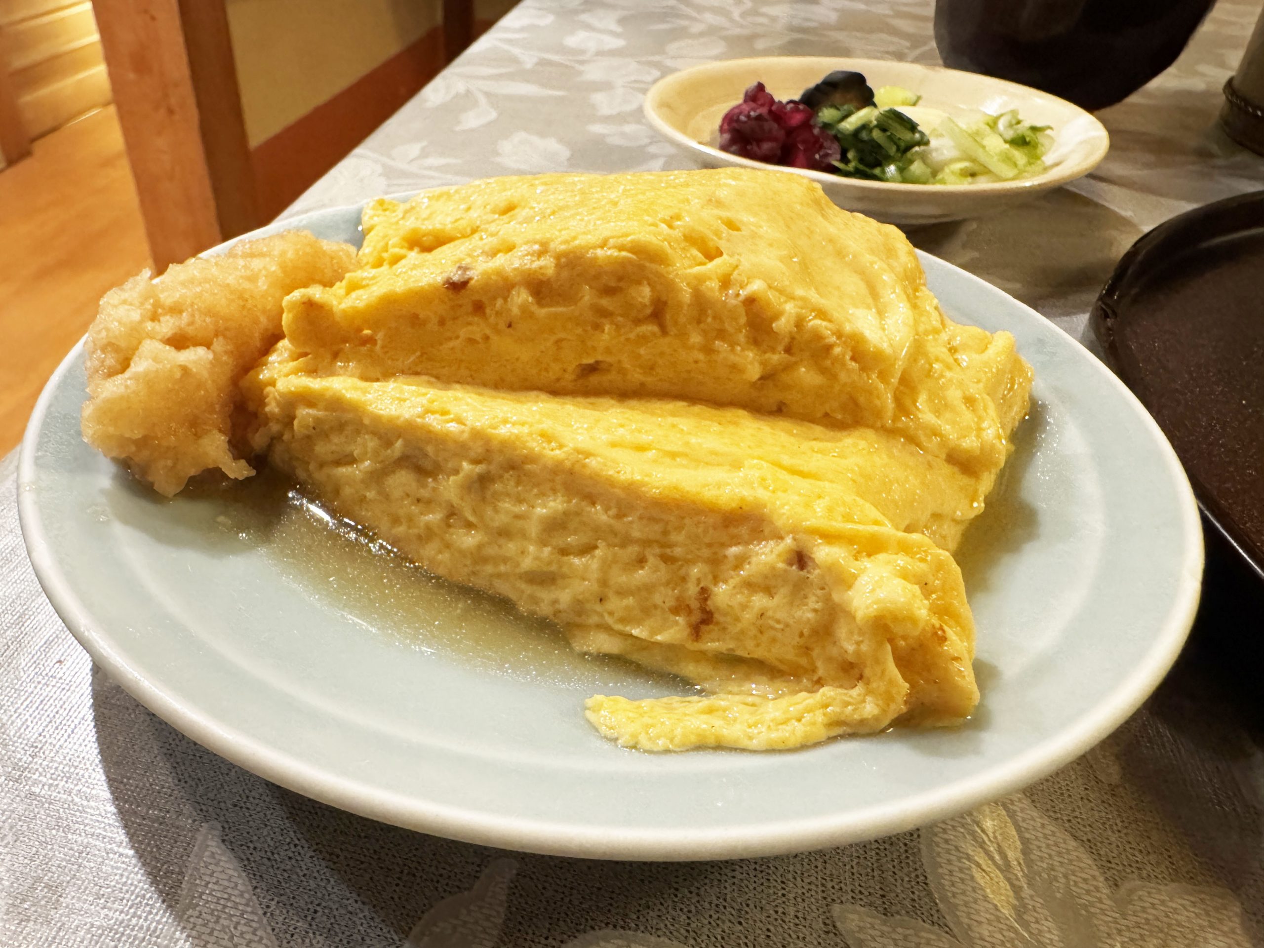「八坂出し巻卵」をオーダーすると、極厚で極上の柔らかさをもった出汁巻き玉子がさってきた。