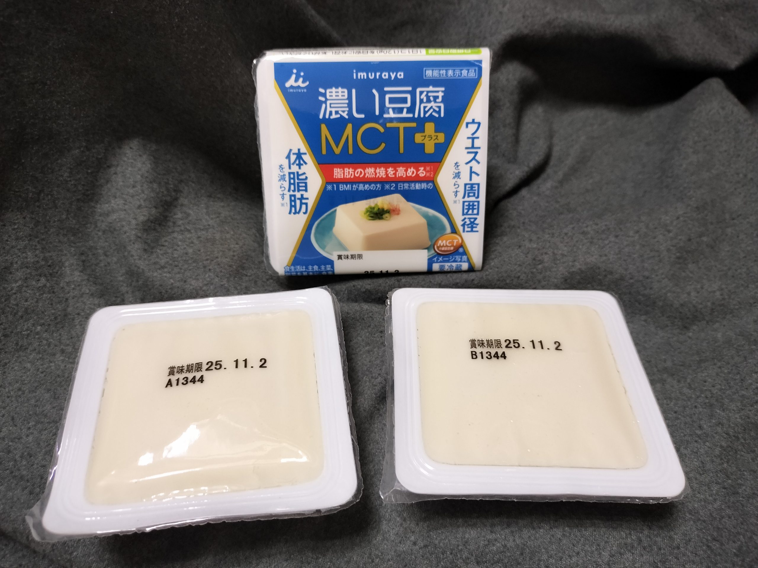 最後に紹介するのは同日新発売の『濃い豆腐MCTプラス』だ。豆腐といえば豆腐なのだが、機能性食品表示のもので中鎖脂肪酸油が脂肪の燃焼を高めると期待される。肝心の味は三重県産大豆を使用した香り高い豆腐で賞味期限が75日もあるので冷蔵庫に入れておいて気が付いたときに食べることができる。これも最後に簡単なアレンジをしてみたので紹介する。