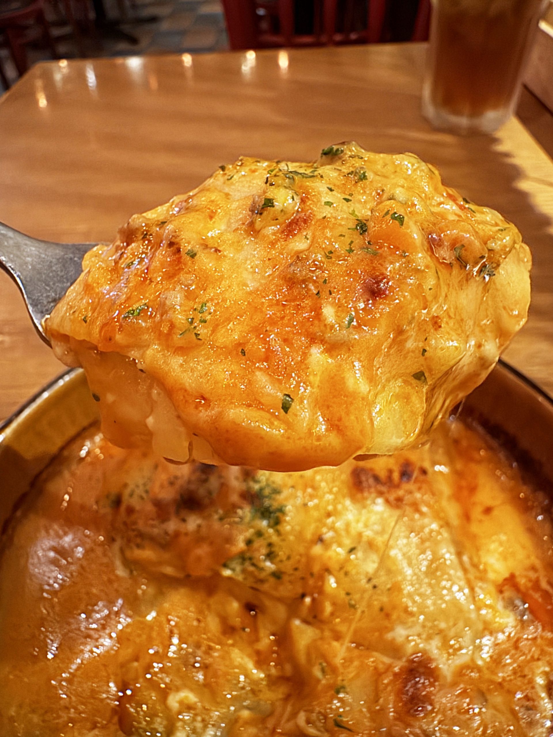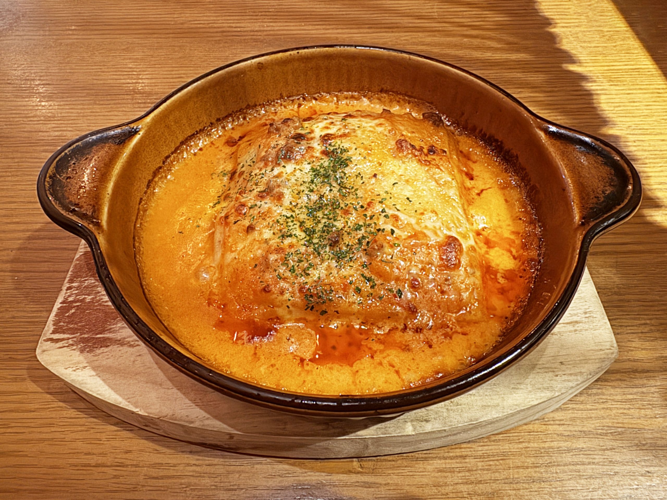 オーダーすると、しっかり焼かれてから登場。かなりアツアツで焼きたて。器は灼熱。ラザニアはグツグツと煮えた状態でやってくる。その時点でワクワク。グラタン、ドリア、焼きカレー、ラザニアは、グツグツしていた方が心が躍る。