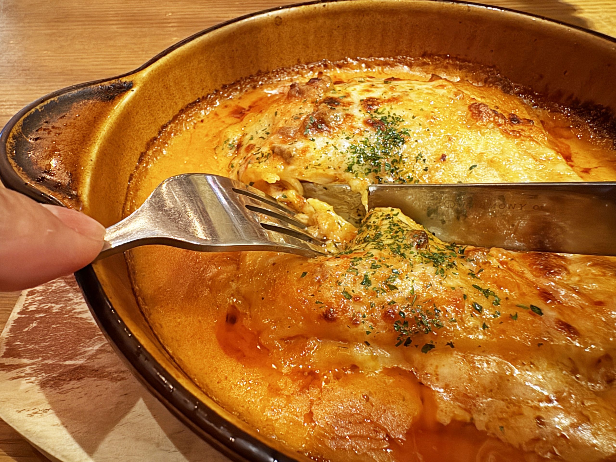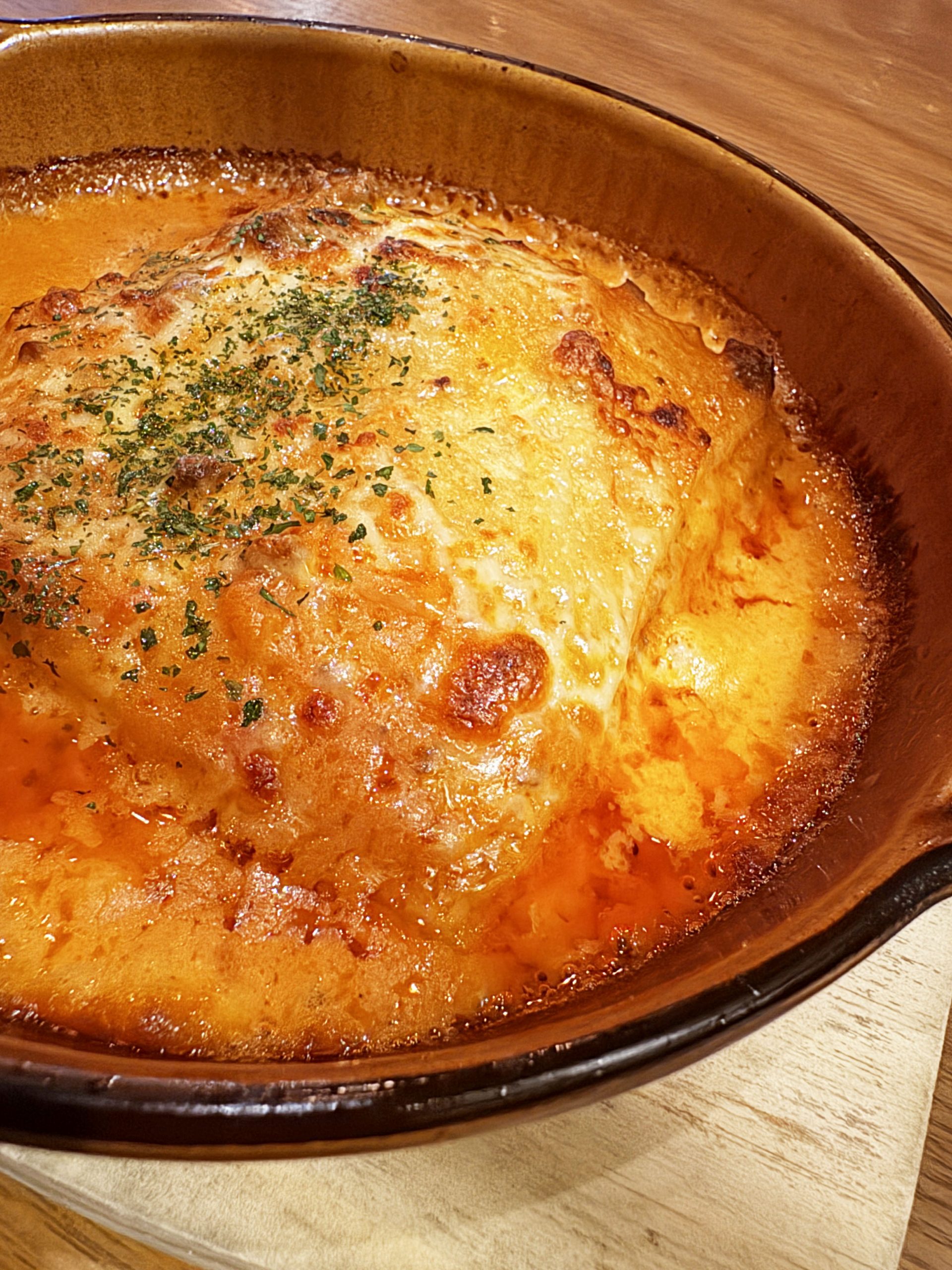 ラザニアはグツグツと煮えた状態でやってくる