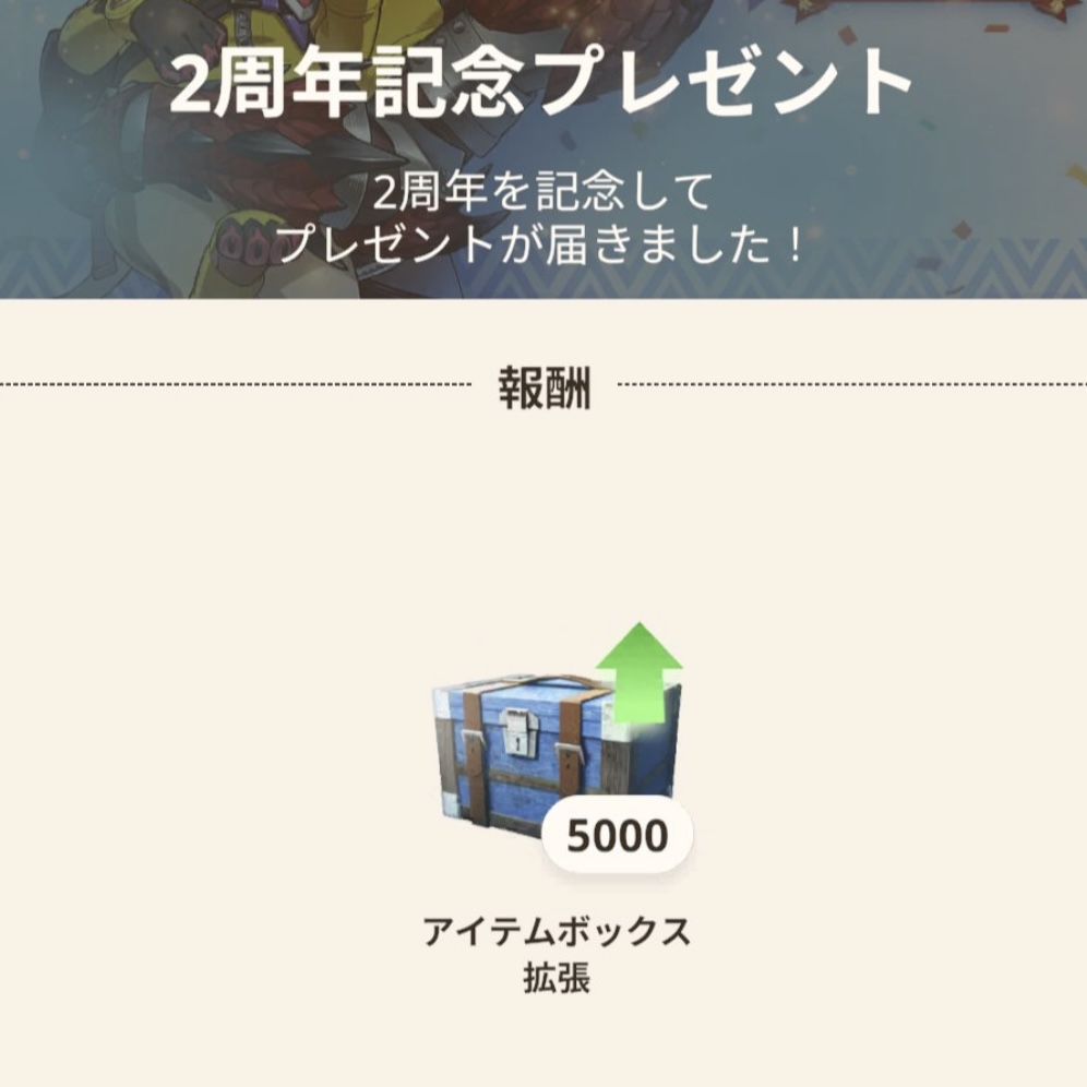 2周年を記念し、全てのハンターはログインするだけで5000枠のアイテムボックス拡張が入手可能。