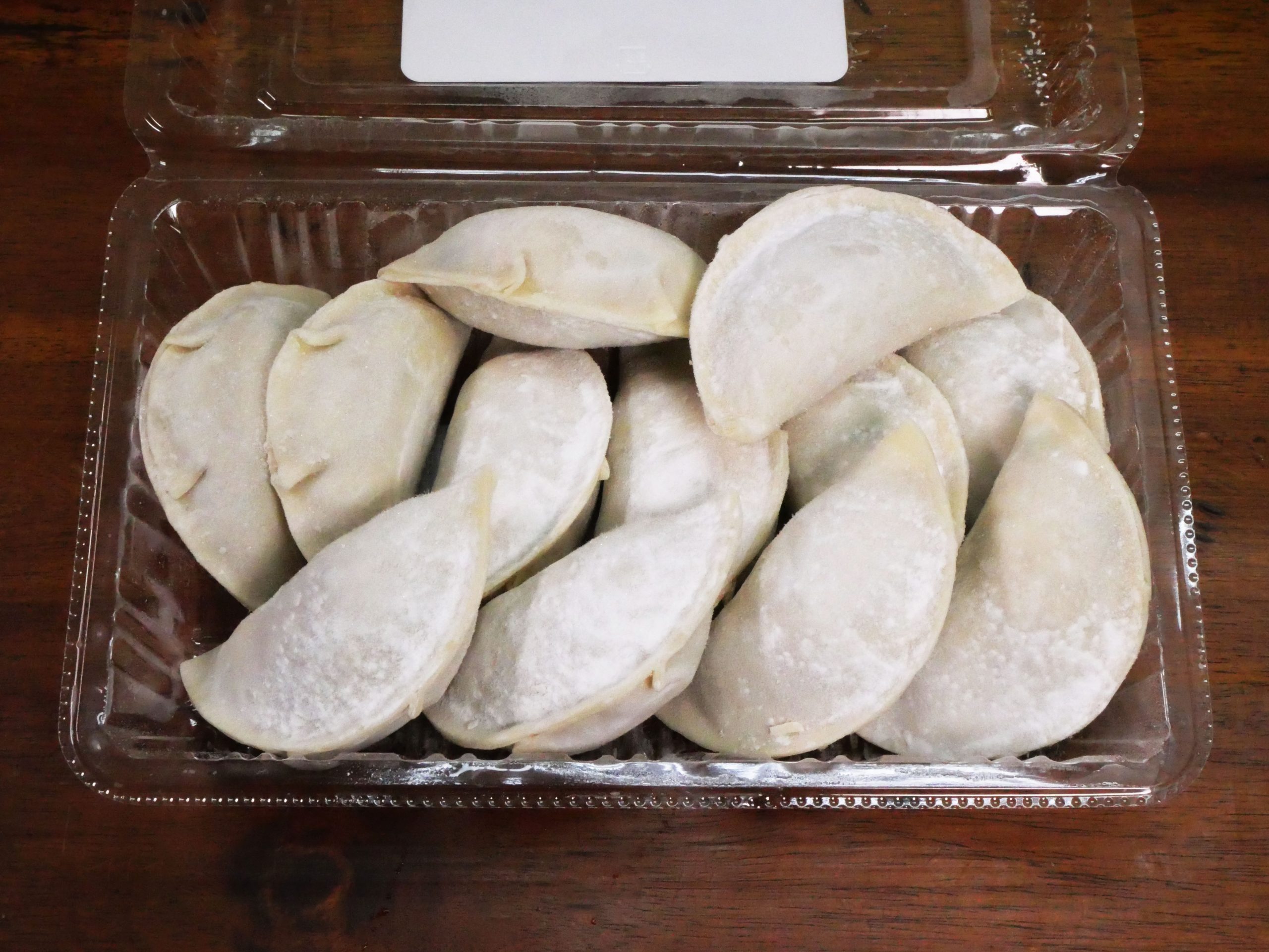 冷凍状態で届き、餃子のビジュアルはかなりボリューミー。純白の皮がパンパンになるほど具が詰まっている。今にも破裂しそうなほどパンパンである。ボンバーマンが破裂する瞬間のようにパンパンである。