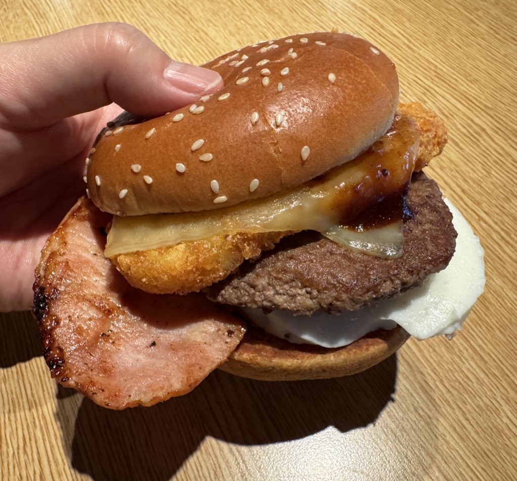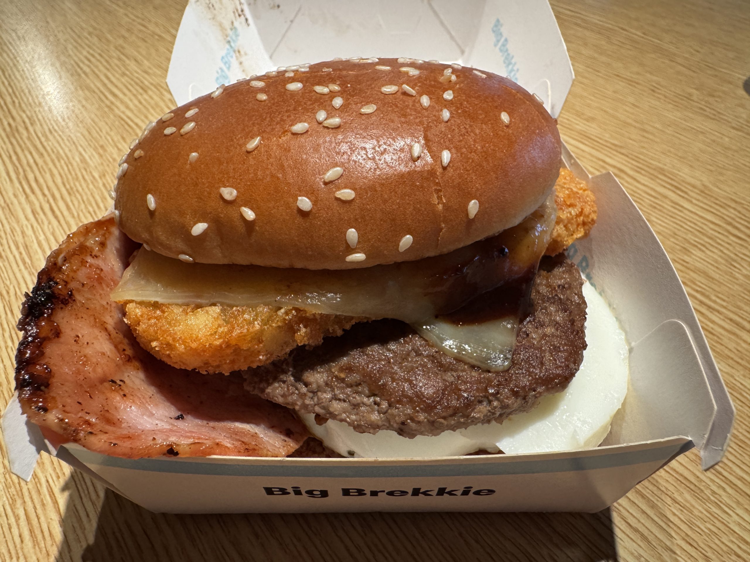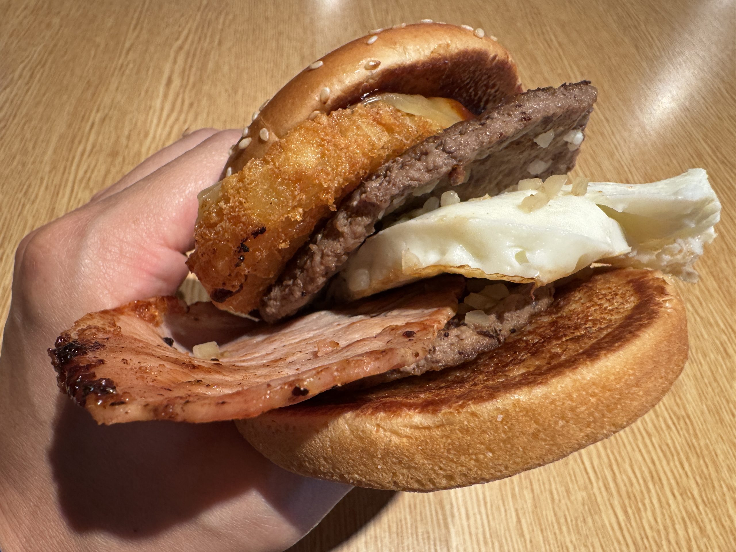 ビッグブレッキーバーガーは、チーズ、ハッシュポテト、目玉焼き、ベーコン、ビーフパティ2枚がサンドされた超絶大ボリュームな朝マックグルメ。はみ出すほど巨大な具の数々。