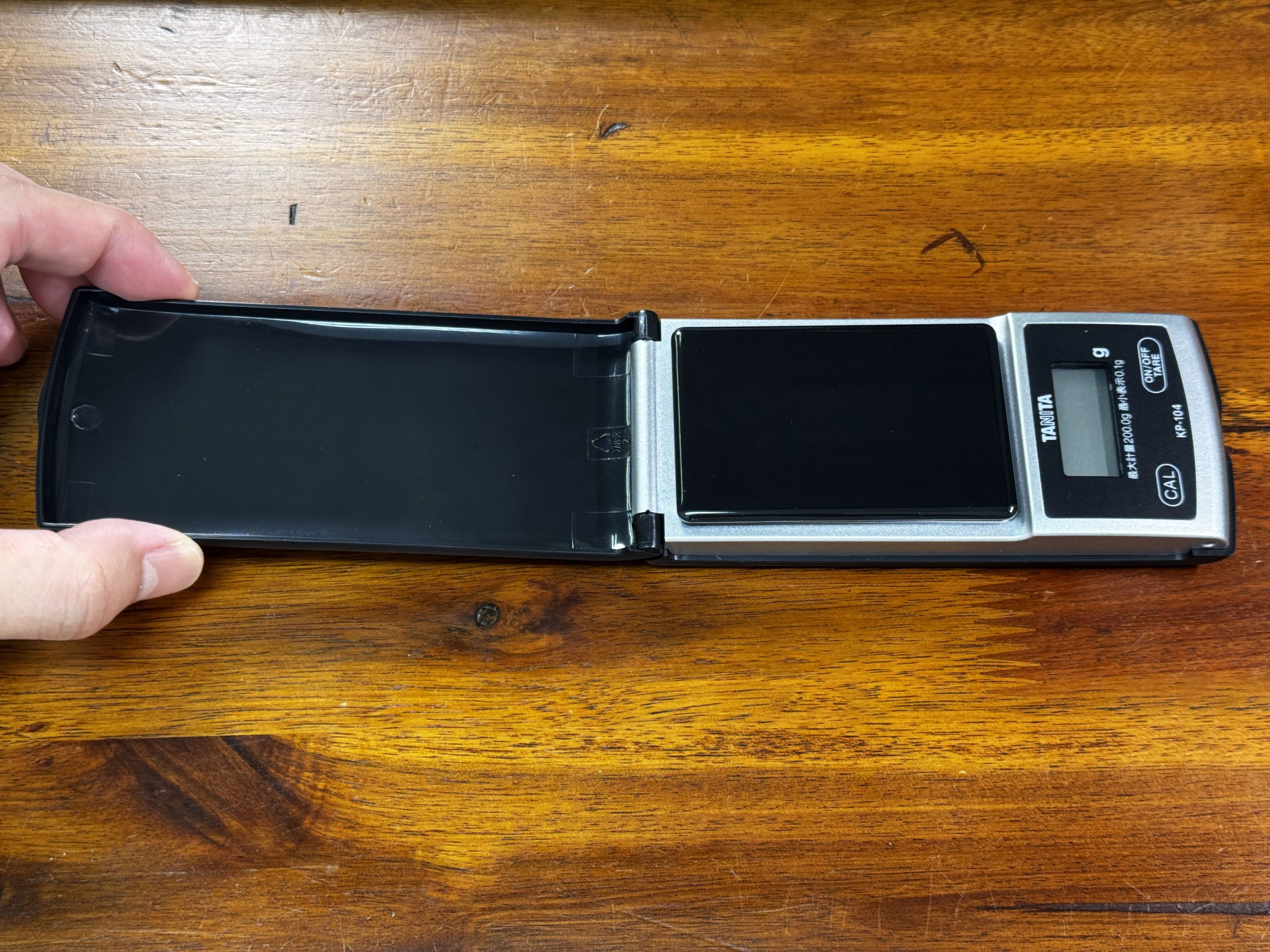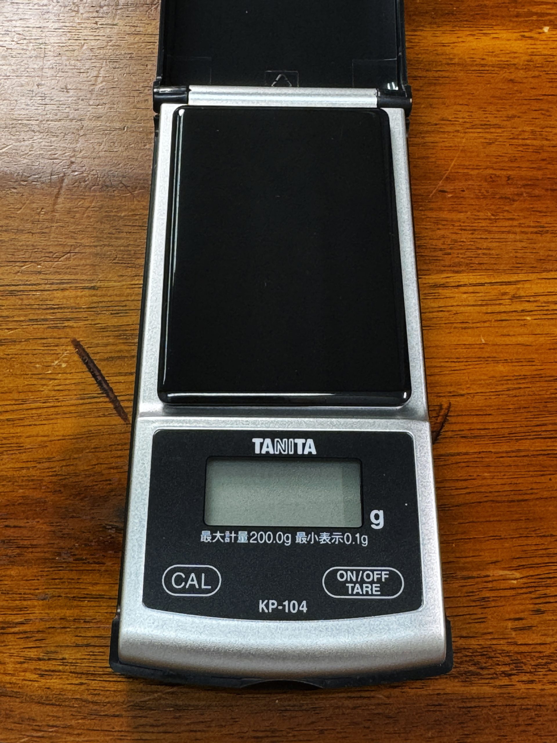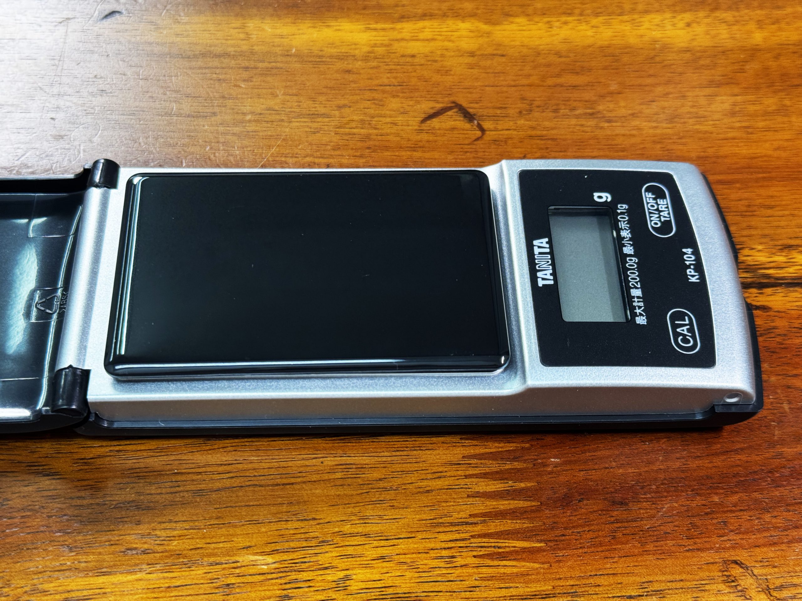 これ、めっちゃ小さい。キッチンスケールには小さなものもありますが、ポケットに入るほど小さいものは稀ですし、なにより0.1グラム単位で量れる超小型スケールは希少。