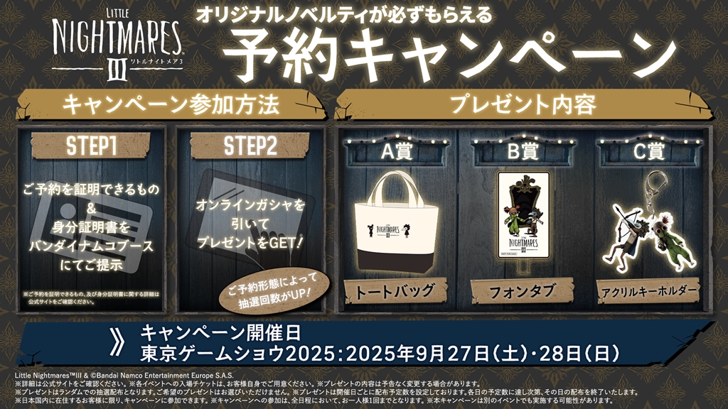 試遊にはリストバンド型の整理券が必要で、配布は開場後からホール6のバンダイナムコブース内「リトルナイトメア3」ブースで開始(なくなり次第終了)。