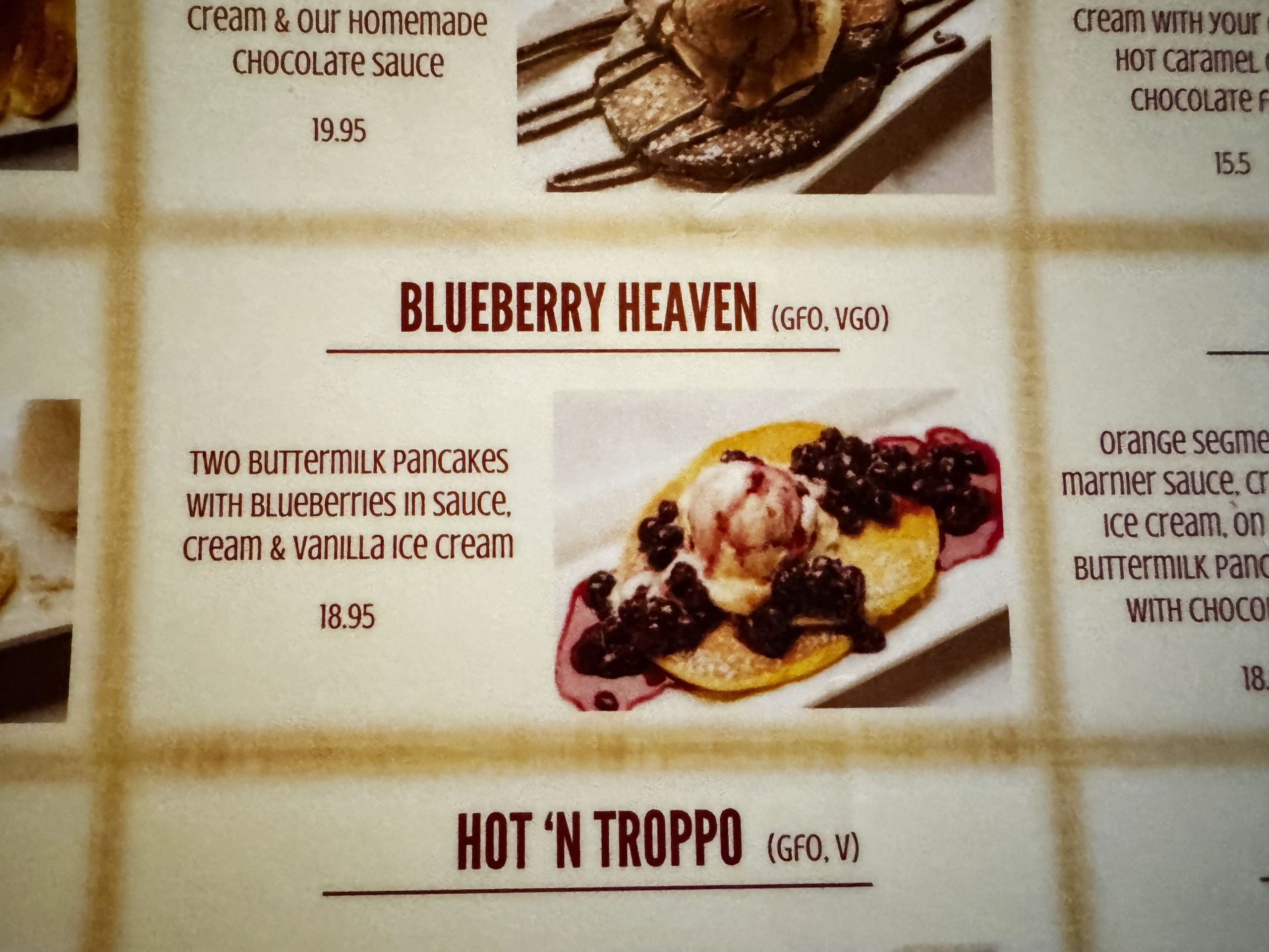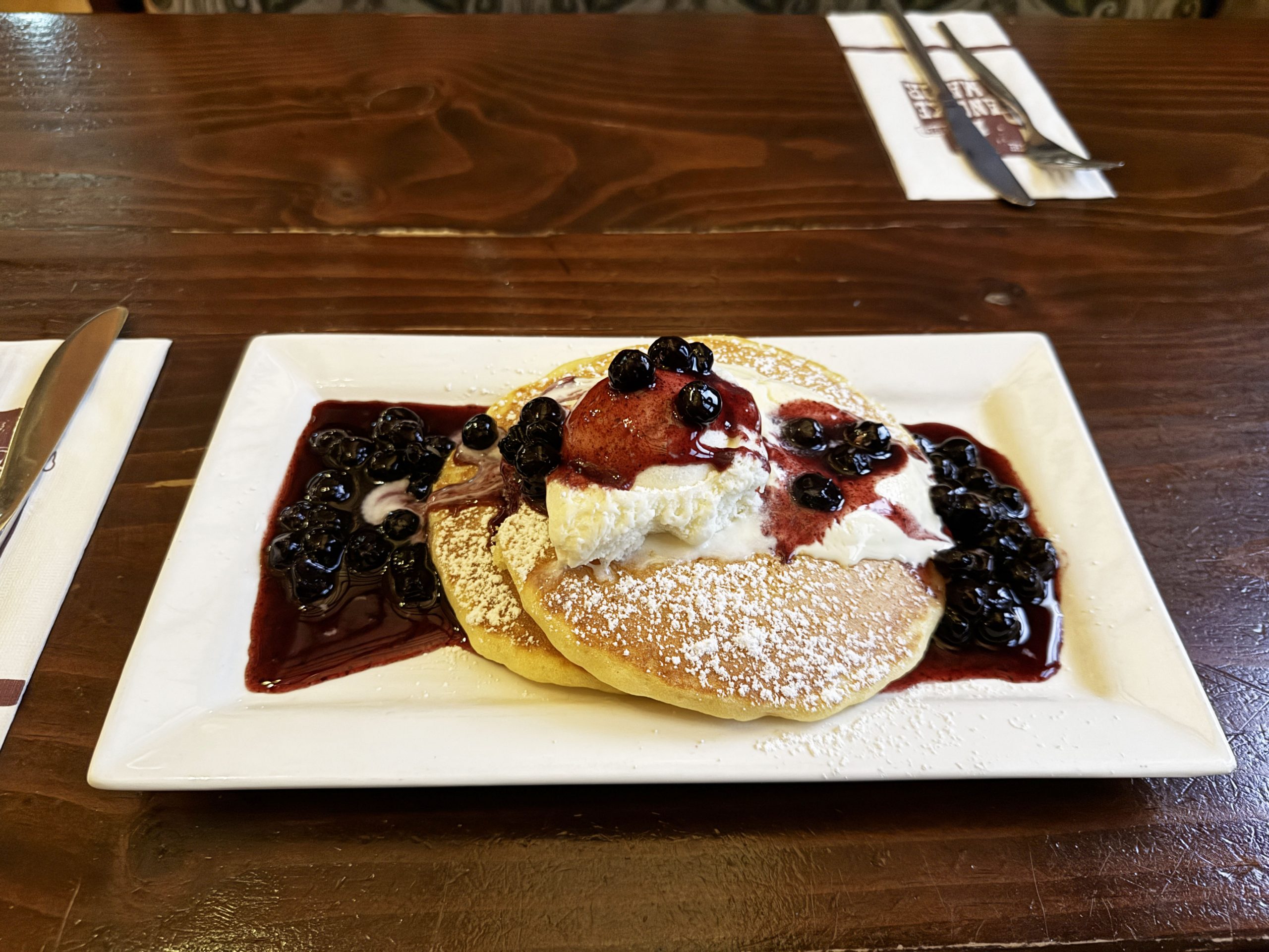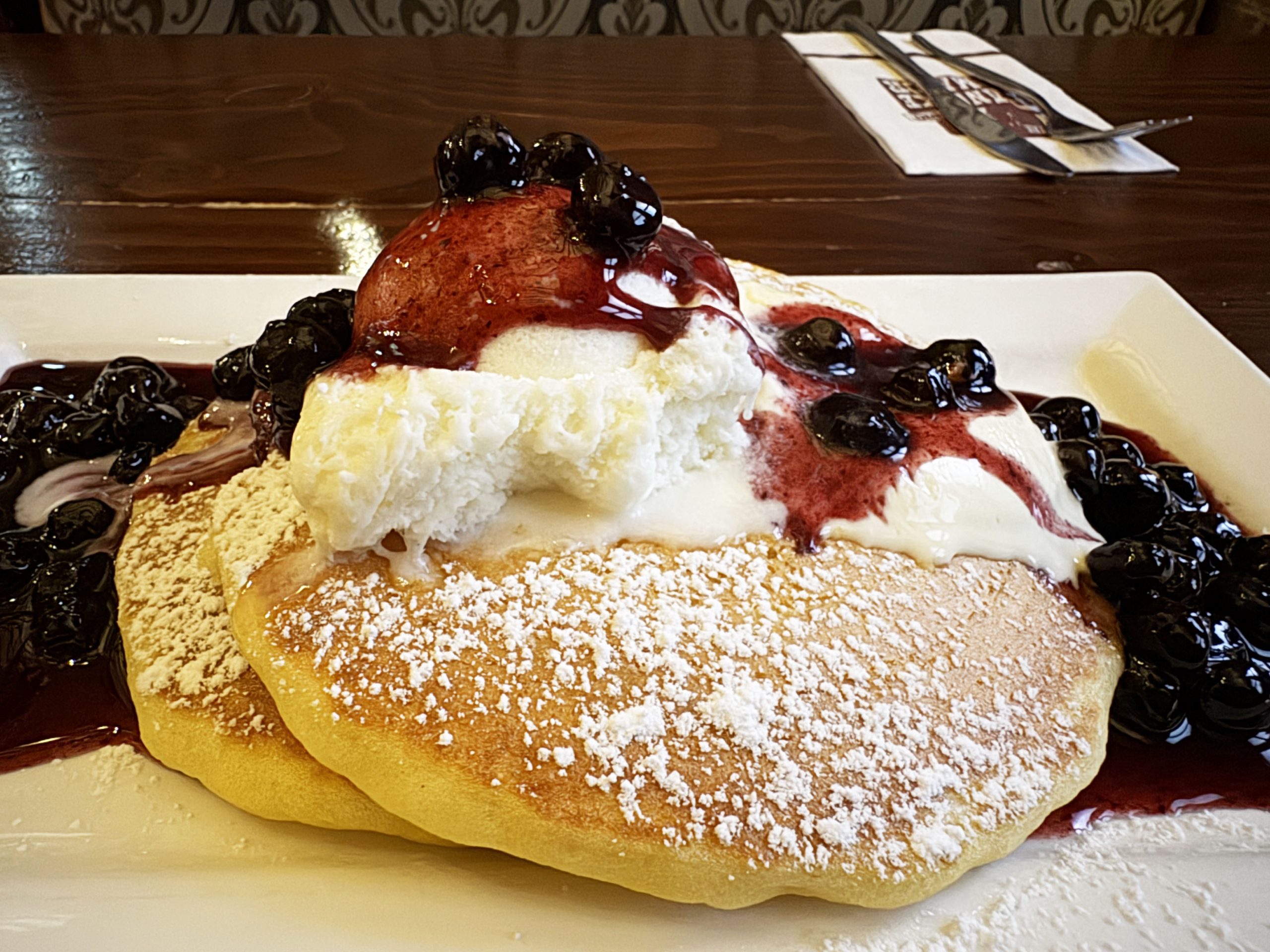 さっそくパンケーキを食べる。おおっ!! わかりやすいブルーベリージャムの味! そして甘さがガツンとパワフルなパンケーキ! どちらもガツン! カツン! と強烈な甘味パンチ!!