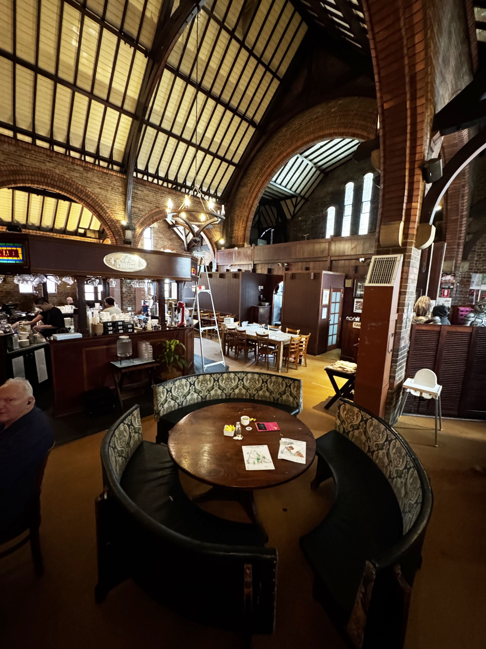 天井が高く、そしてレンガ造りの内装は、確かに教会っぽさある。もしパンケーキ屋をやめても、翌日には教会として復活できる勢い。もう空気が教会。ずっとここにいたい気持ちになる。落ち着くのだ。寺とか神社の中にいるみたいな感じ?
