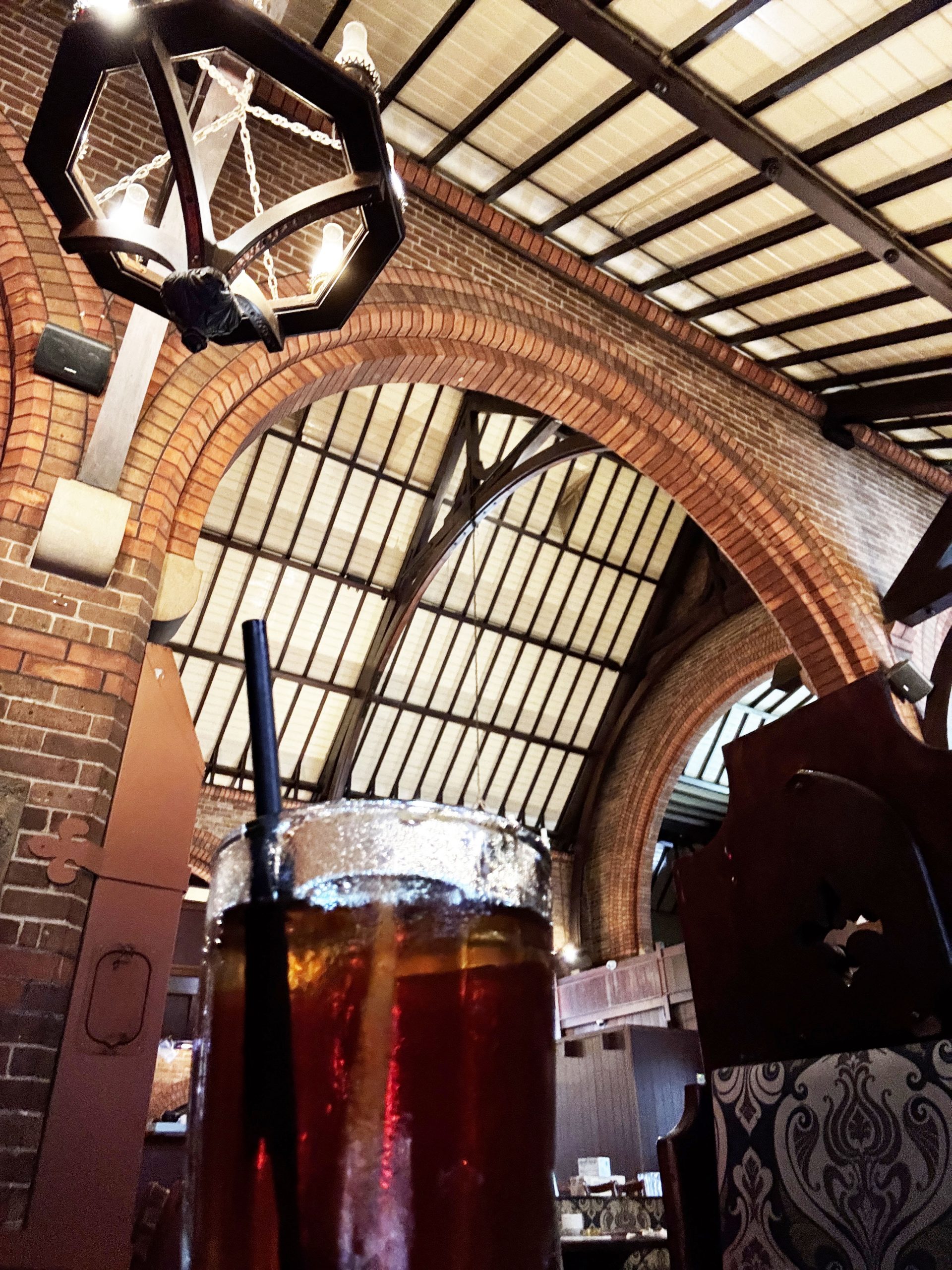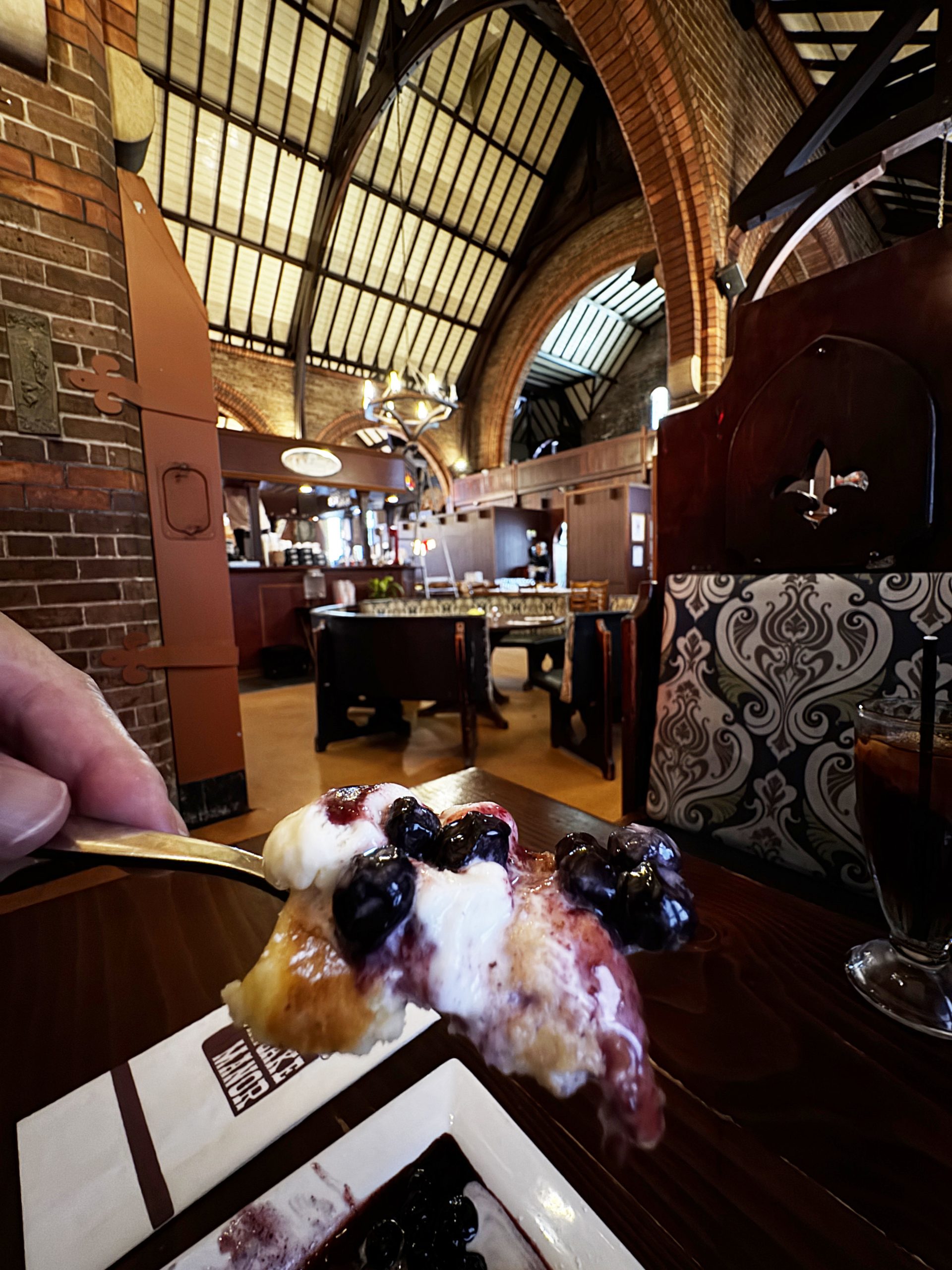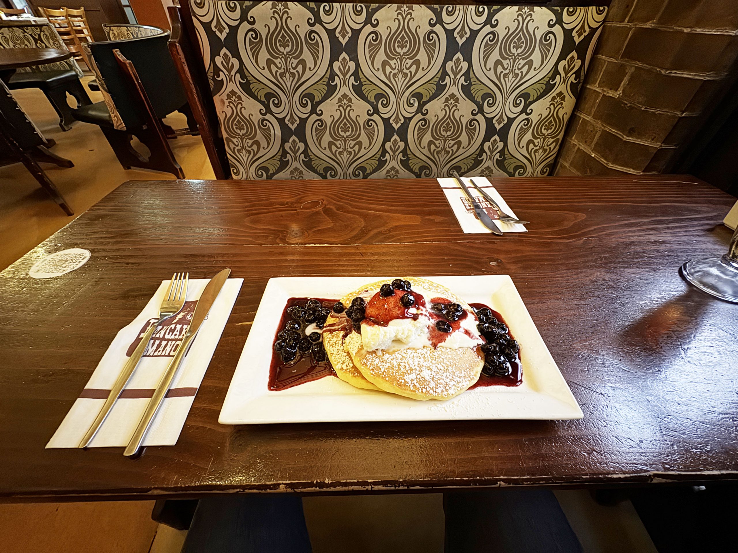 目の前にやってきたのはブルーベリーのパンケーキとアイスティー。ブルーベリーたっぷり! パンケーキふわふわっぽ! 1904年に教会を建てた職人も、120年後にパンケーキを食べる場所になっているとは思うまい。しかし、食べているのだ、教会だった建物の中で!
