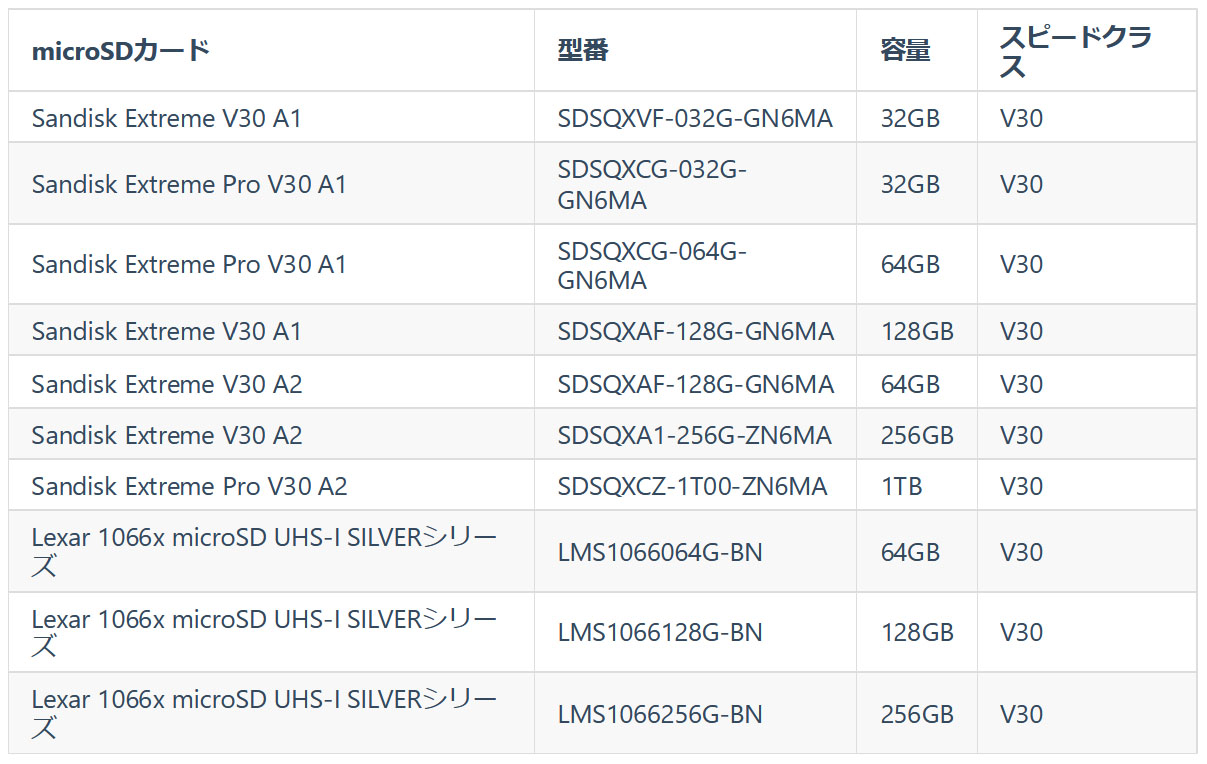 公式は、Insta360公式ストアで販売されている純正microSDカードの使用を推奨している。そのうえで、以下のSanDiskのSDカードでも動作確認ができているという。