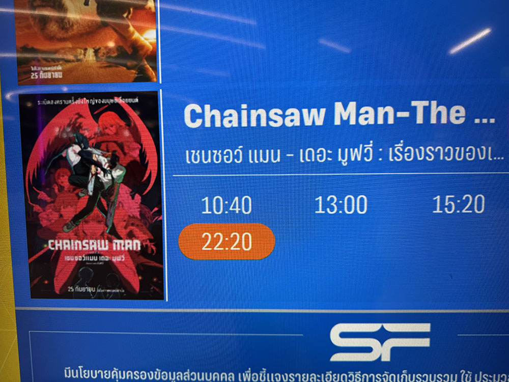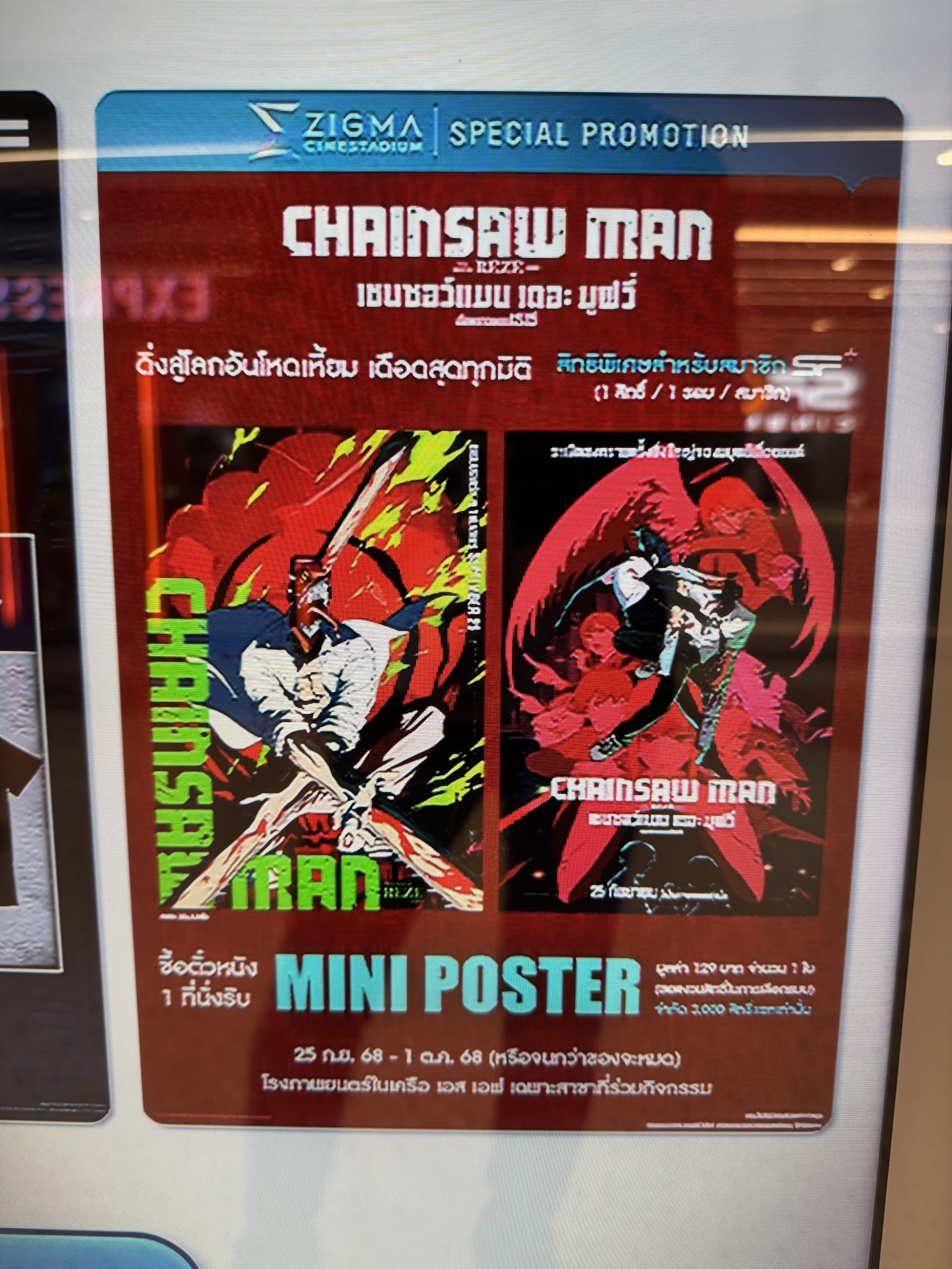 大絶賛上映中の映画「チェンソーマン レゼ篇」ですが、タイでも絶大に支持を得ている作品です。映画館では大々的に「チェンソーマン レゼ篇」を推しており、映画を観る前からワクワクが止まらない状況となっています。