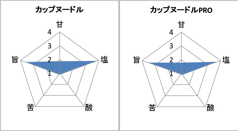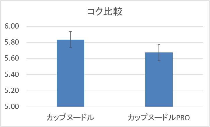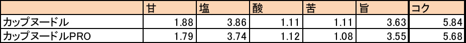 最も差が出ていたのは総合的な味の強さを示す「コク」の数値。通常のカップヌードルがカップヌードルPROを0.16ポイントほど上回っていました。