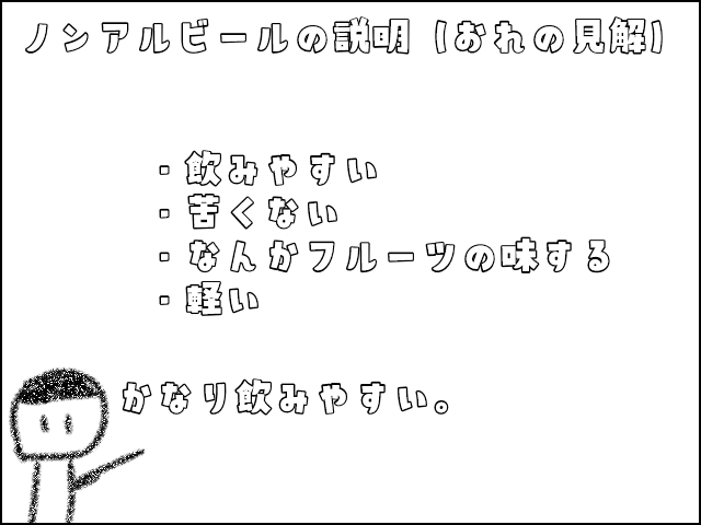 このように、かなり違った。やっぱり全然違っていた。父にノンアルを飲んでもらったら「コーラとドクターペッパーぐらい違う」と言っていた。そんなに。