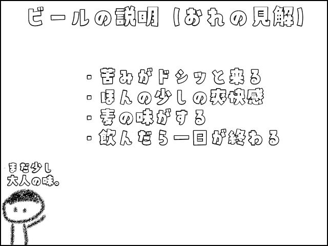 個人的にビールを飲んだときに感じることはこう。やはり「苦い」が先に来る。まだまだ飲みなれていないので。あとこんな検証をしていてなんだが、おれは酒に弱い。助けてほしい。