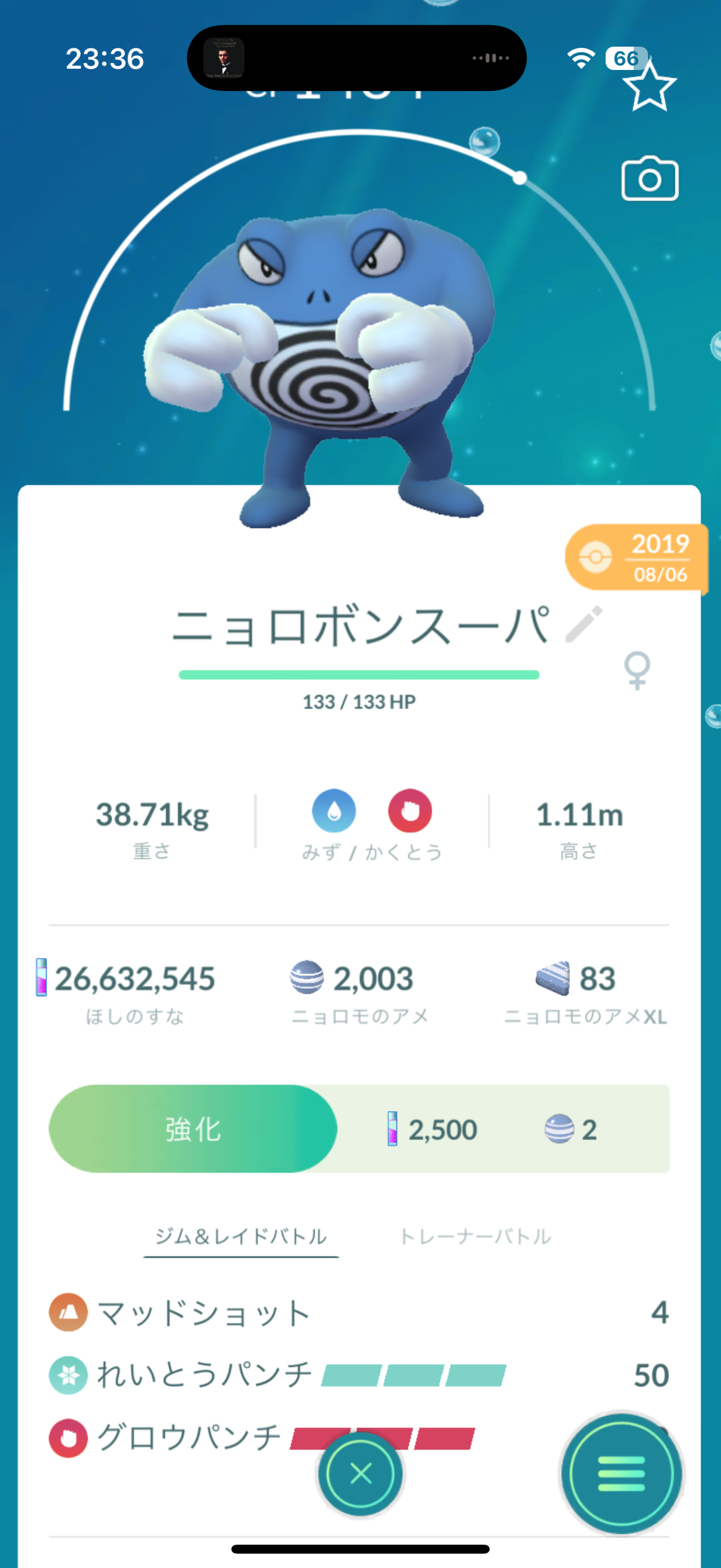 ▲ジムバトルでもカウントされるので、あえて弱めの火力の技で荒稼ぎするテクニックも。ジムバトルにおいて頻出する「ハピナス」「ラッキー」に対し、“マッドショットxグロウパンチ”を習得した「ニョロボン」などで挑戦すると、かなりの回数を稼げますよ。