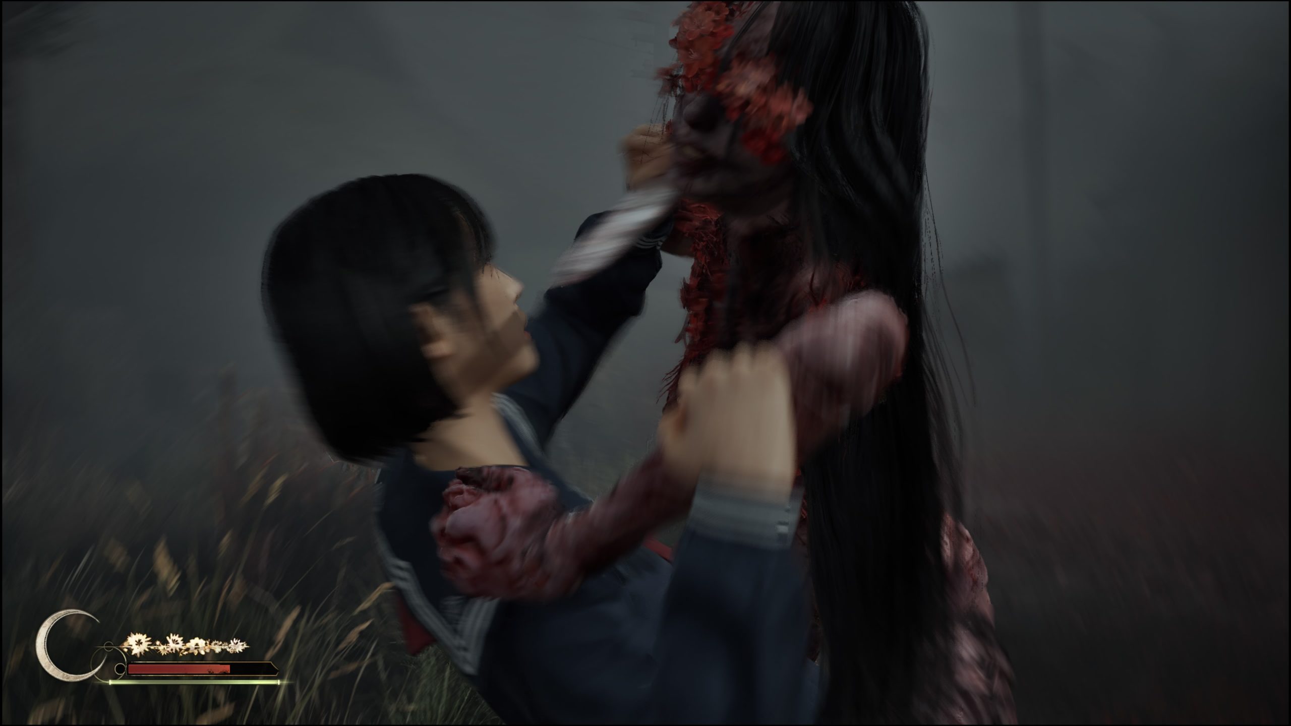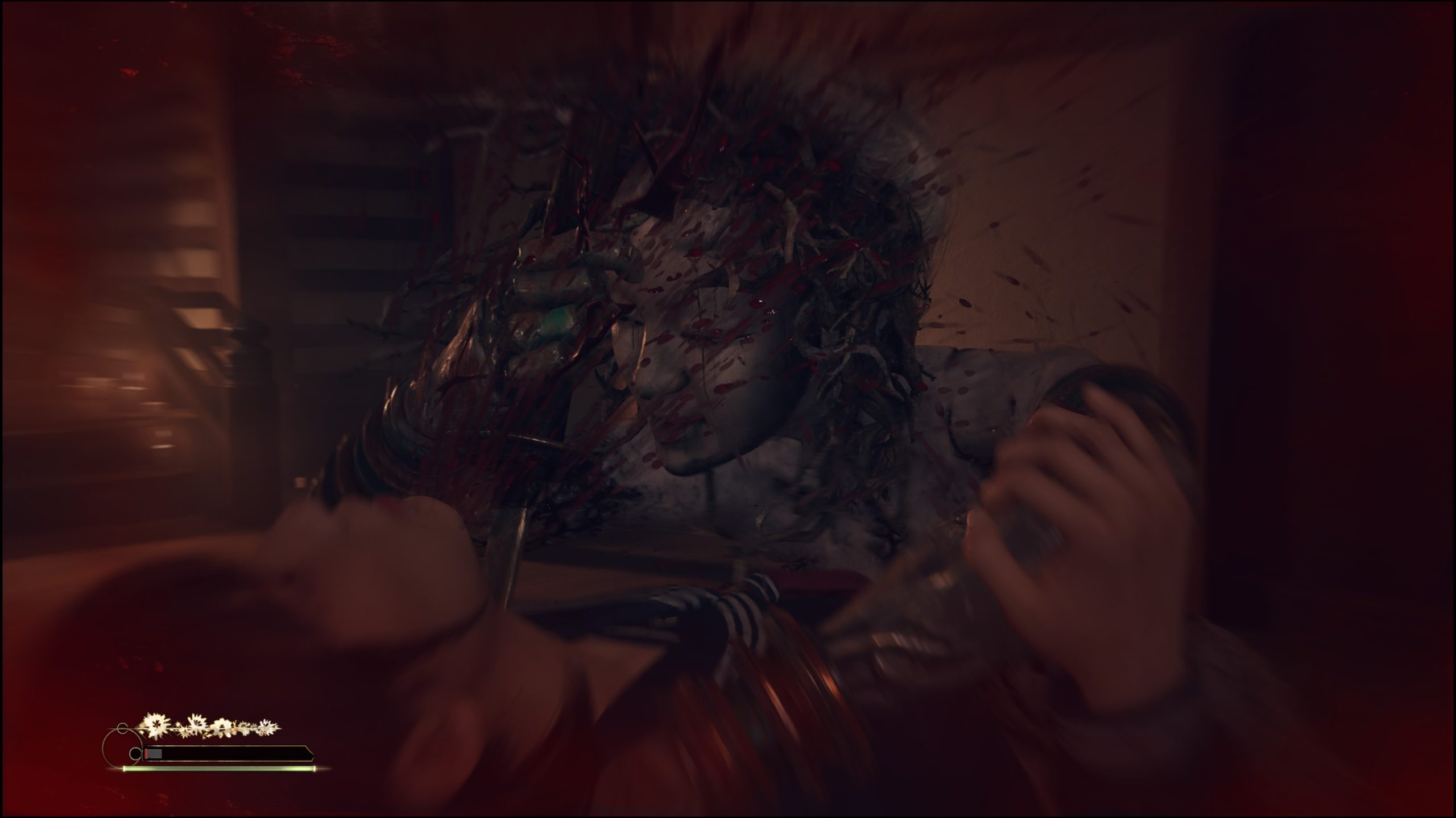 「敵の攻撃の隙を突き、反撃を狙う」という点で本作のバトルは、パリィを中心としたソウル系の3DアクションRPGに近い。ただ、本作のバトルをサイコロジカルホラーたらしめているのが、「集中」というアクションだろう。「集中」状態では「見切り反撃」のサイン表示が長くなり、「見切り反撃」を成功しやすくなる。