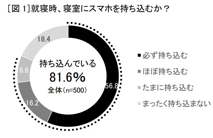 ソフトバンクが実施した調査(日常的にスマホを利用する15歳〜69歳の男女500人対象)では、スマホで夜ふかしをした経験がある人のうち、81.6%が寝室にスマホを持ち込んでいることが分かった。就寝時のスマホ持ち込みは「必ず持ち込む」が56.8%、「ほぼ持ち込む」が16.2%、「たまに持ち込む」が8.6%で合計81.6%だ。