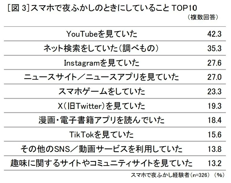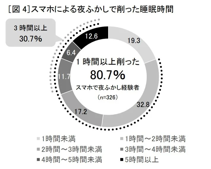 夜ふかしの内容は「YouTubeを見ていた」が42.3%、「ネット検索をしていた」が35.3%、「Instagramを見ていた」が27.6%と動画・SNSが上位を占める。睡眠時間を削った割合は「1時間〜2時間未満」が32.8%で、全体の80.7%が「1時間以上」、30.7%が「3時間以上」だ。