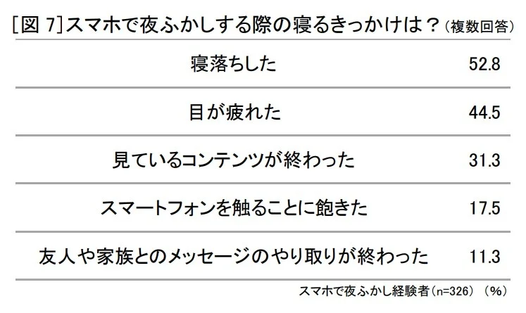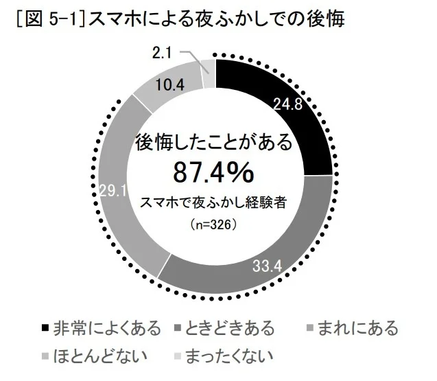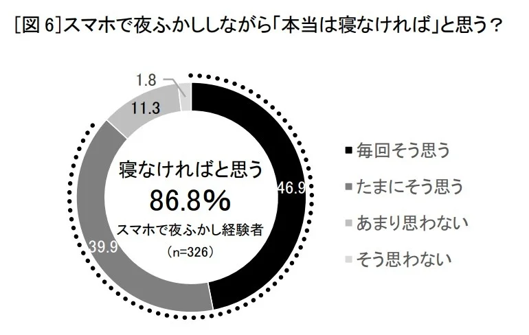 後悔した人は87.4%で、翌日の影響は「集中力が低下」が73.6%、「眠気でパフォーマンス低下」が73.6%、「身体的な不調」が67.8%である。「本当は寝なければ」と感じる人は86.8%だが、寝るきっかけは「寝落ちした」が52.8%だ。